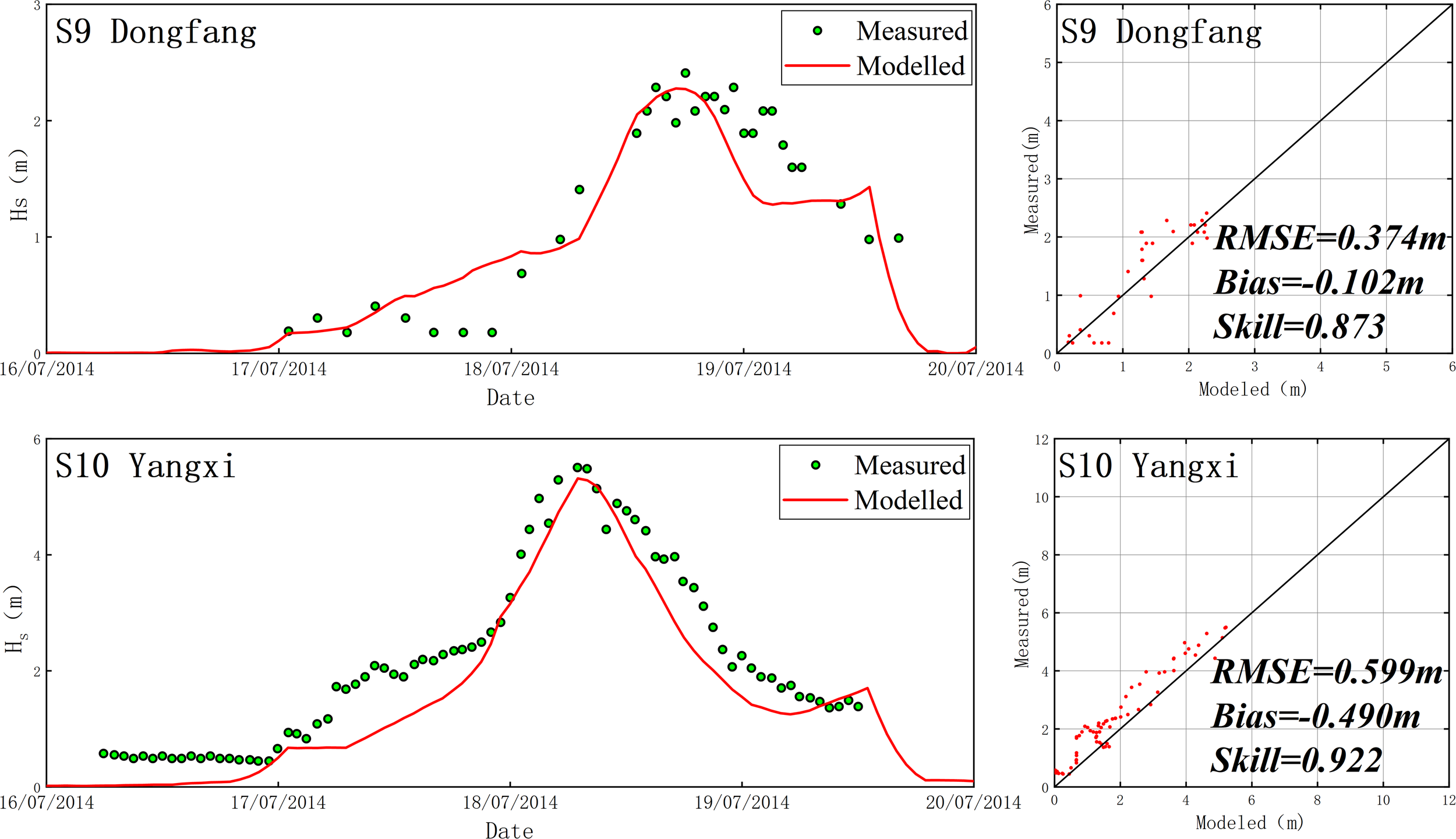 Three widely used error statistic indicators (Root Mean Square Error, Bias and Skill Score) are employed to in the validation of the tide-surge-wave coupled model. Root Mean Square Error (RMSE) is defined as: