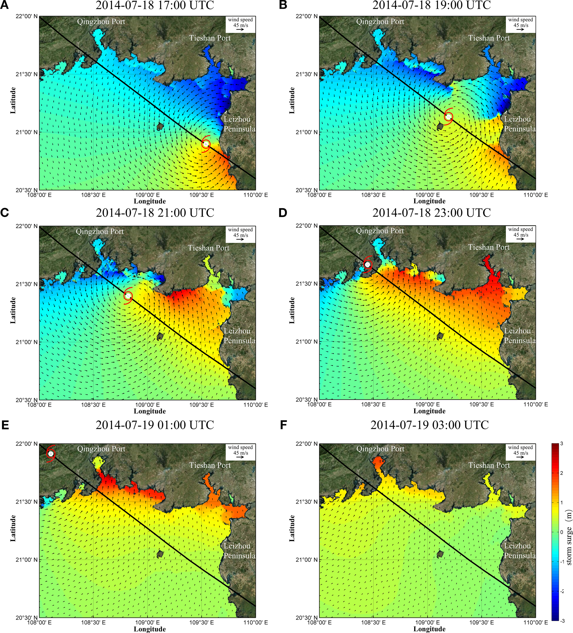 Maps showing storm surge progression in BeiBu Gulf from July 18 to 19, 2014: (A) 2014-07-18 17:00 UTC, (B) 2014-07-18 19:00 UTC, (C) 2014-07-18 21:00 UTC, (D) 2014-07-18 23:00 UTC, (E) 2014-07-19 01:00 UTC, (F) 2014-07-19 03:00 UTC.