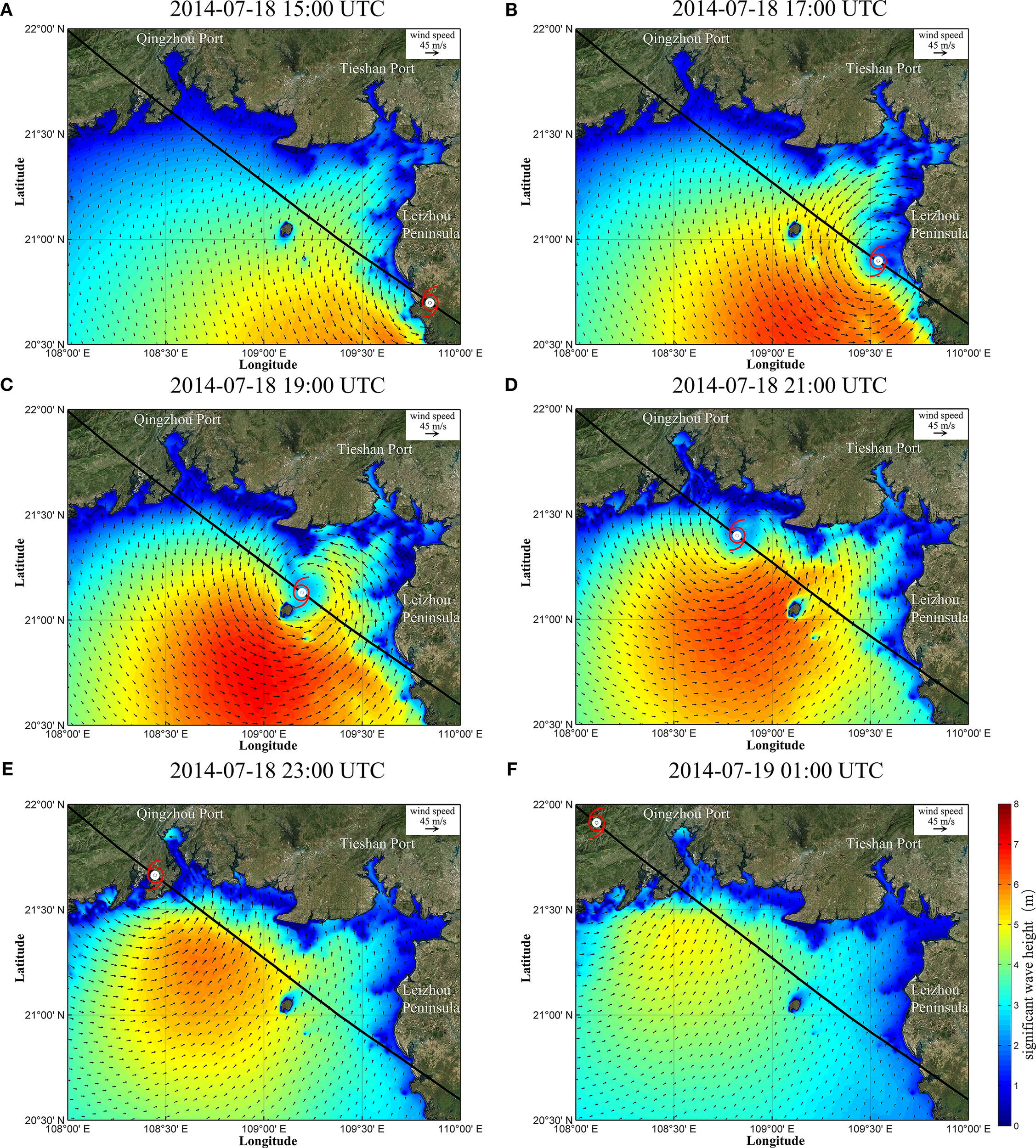 Maps showing wave progression in BeiBu Gulf from July 18 to 19, 2014: (A) 2014-07-18 15:00 UTC, (B) 2014-07-18 17:00 UTC, (C) 2014-07-18 19:00 UTC, (D) 2014-07-18 21:00 UTC, (E) 2014-07-18 23:00 UTC, (F) 2014-07-19 01:00 UTC.