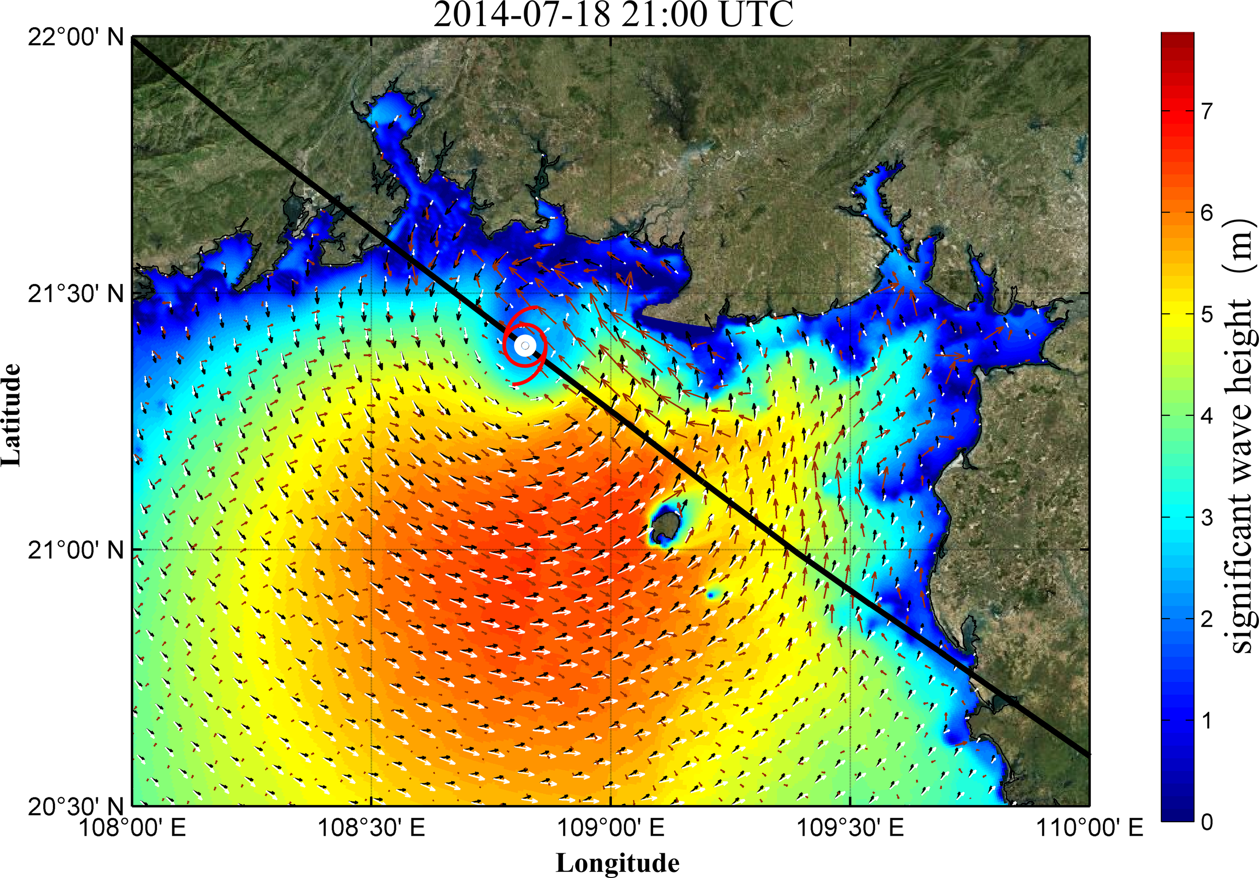 Simulated wind field (black arrows), wave field (brown arrows), and current field (white arrows) after Typhoon Rammasun (2014) entered the BBG.