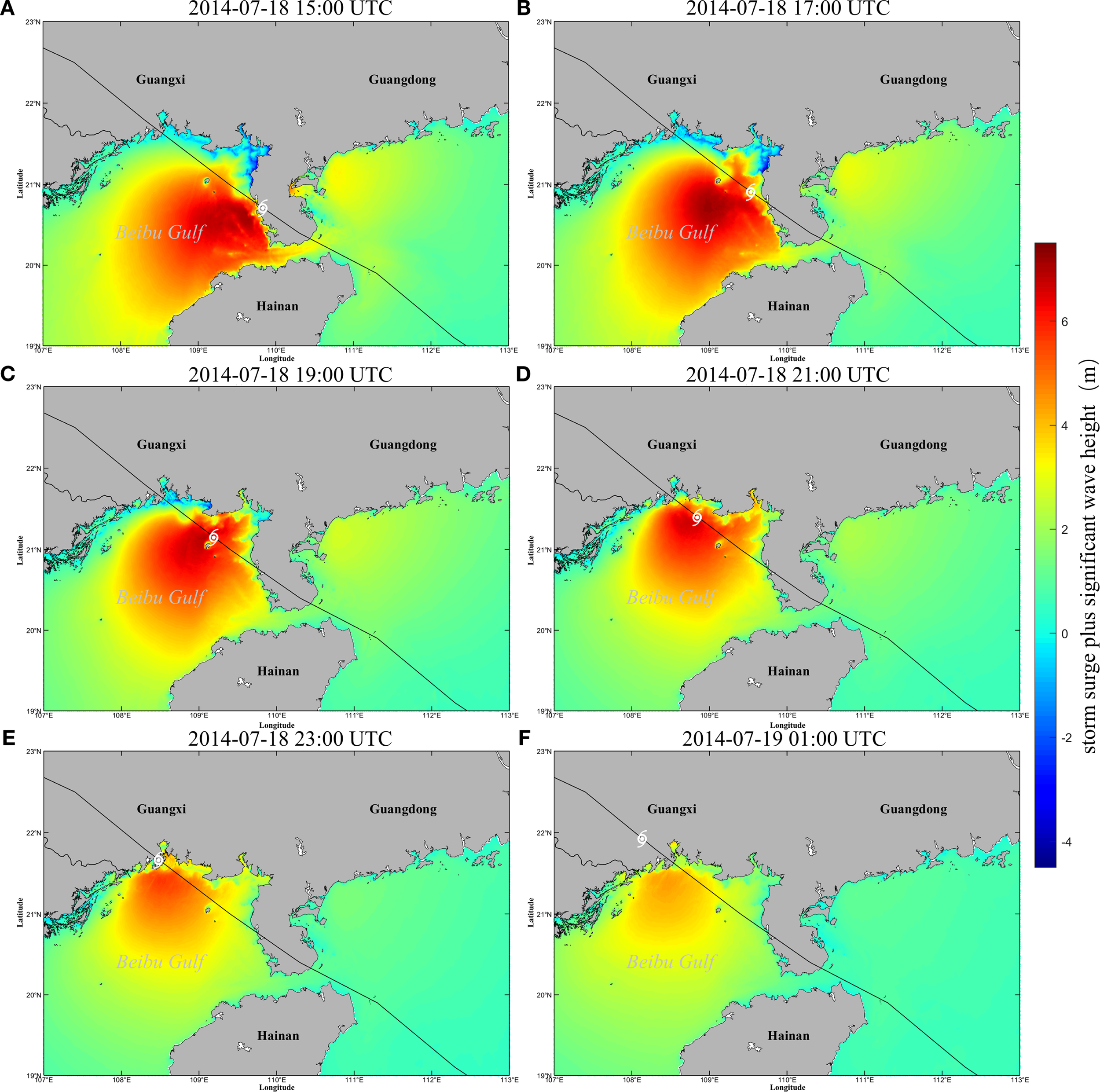 Maps showing storm surge plus significant wave height in Beibu Gulf from July 18 to 19, 2014: (A) 2014-07-18 15:00 UTC, (B) 2014-07-18 17:00 UTC, (C) 2014-07-18 19:00 UTC, (D) 2014-07-18 21:00 UTC, (E) 2014-07-18 23:00 UTC, (F) 2014-07-19 01:00 UTC.