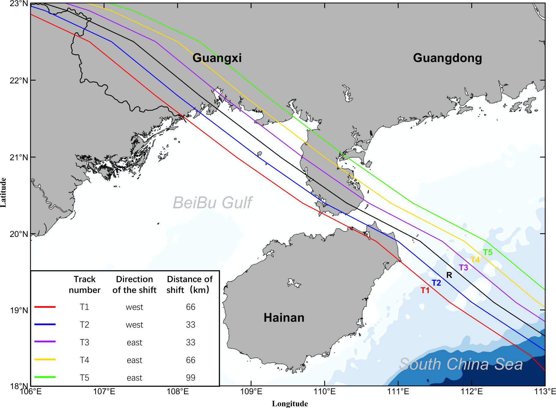 Knowledge on future storm surge and typhoon wave in response to climate change is of significance for the design of coastal defense and construction of engineering like ports and channels. To investigate the potential impacts of typhoon tracks, this study employs a typical typhoon track construction method to re-simulate the typhoon process in the Beibu Bay. Five additional typhoon scenarios (namely T1 to T5 from west to east) have been generated, with the duration and intensity of Rammasun unchanged but the track shifted (Figure 12). The five parallel tracks (T1–T5) were designed based on historical typhoon climatology in the Beibu Gulf to cover critical landfall scenarios from west to east, ensuring representativeness of spatial surge and wave response patterns. The spatial distribution of maximum positive surges, maximum negative surges, and significant wave heights during each typhoon scenario were then analyzed.