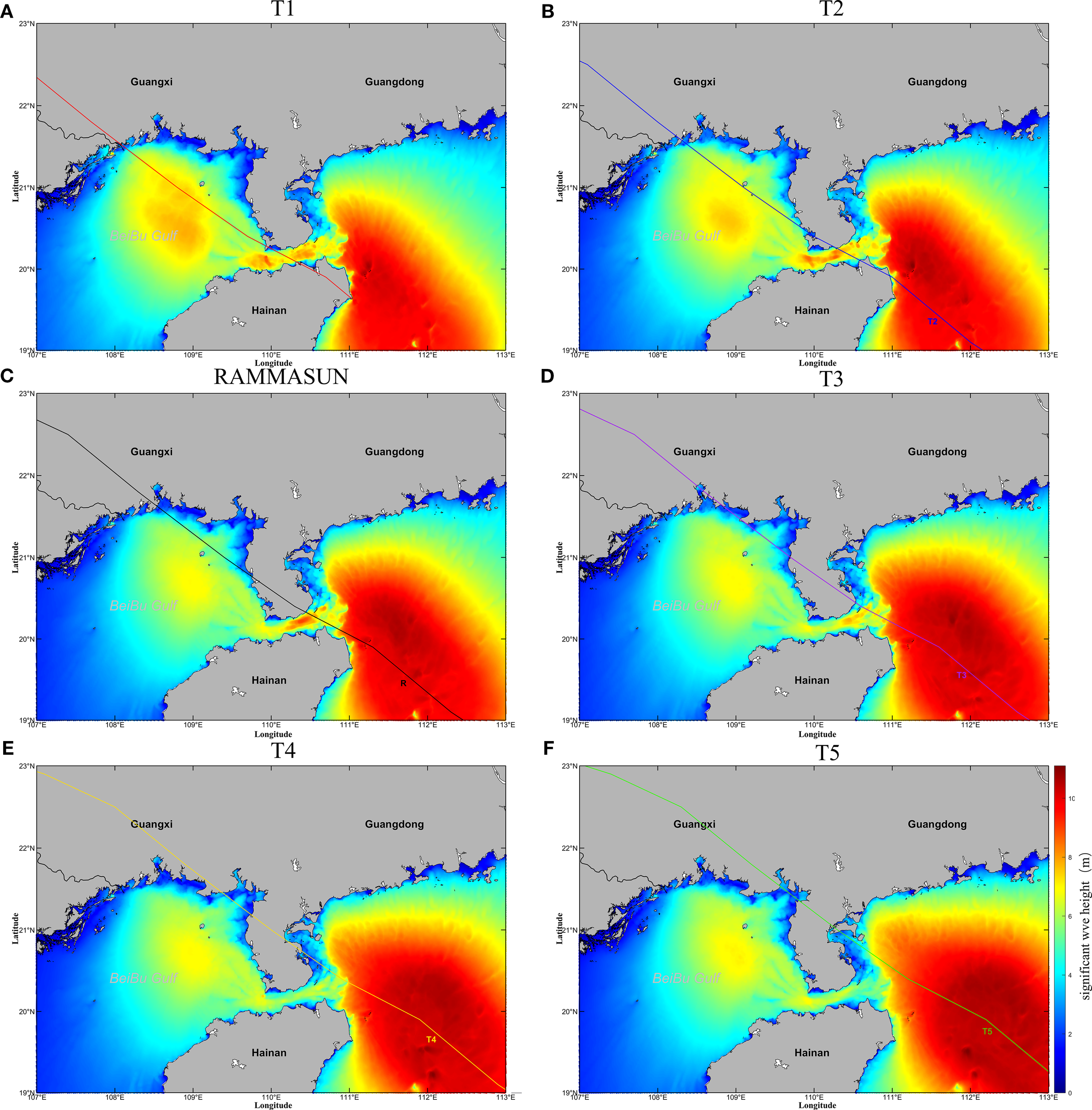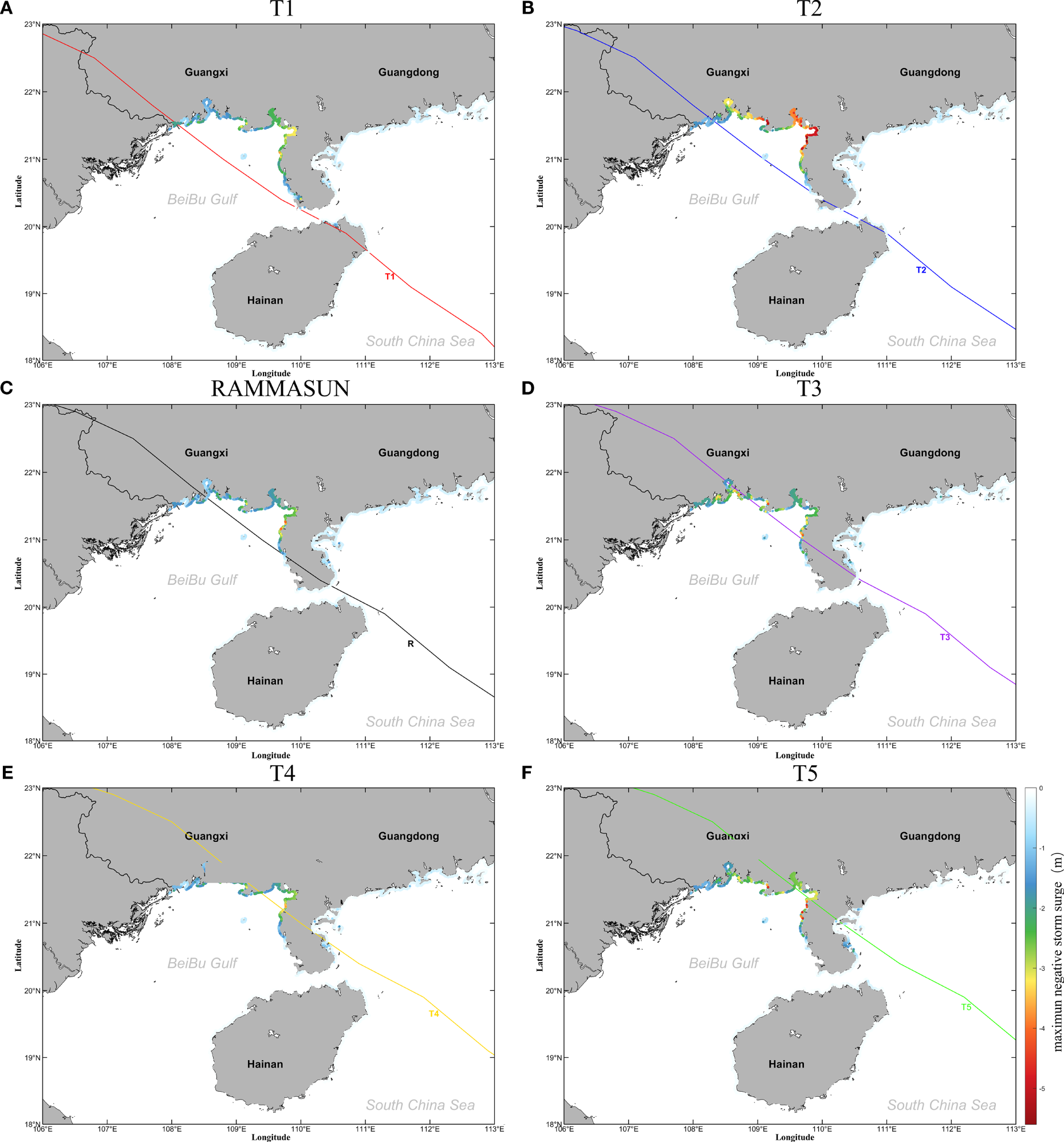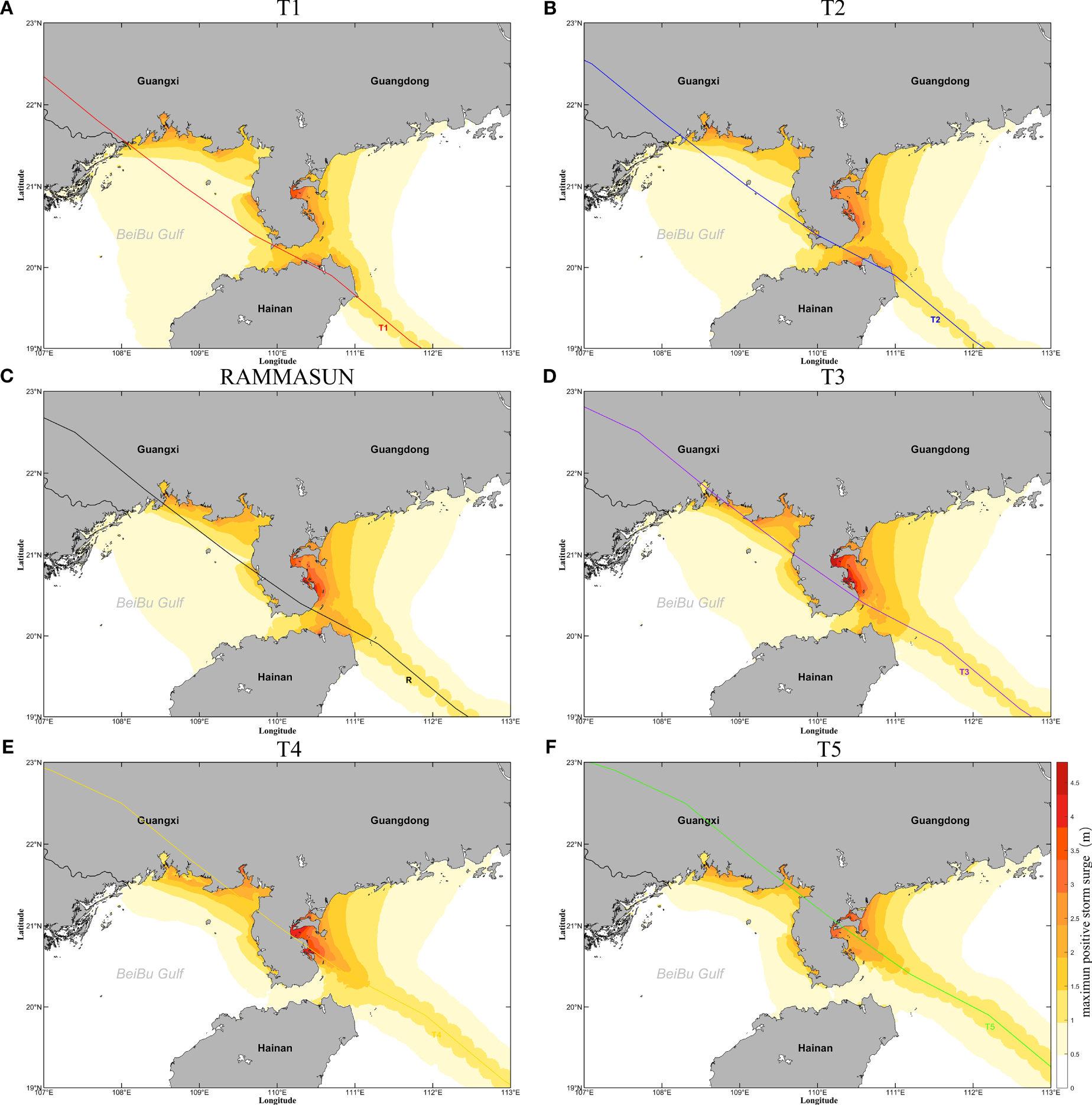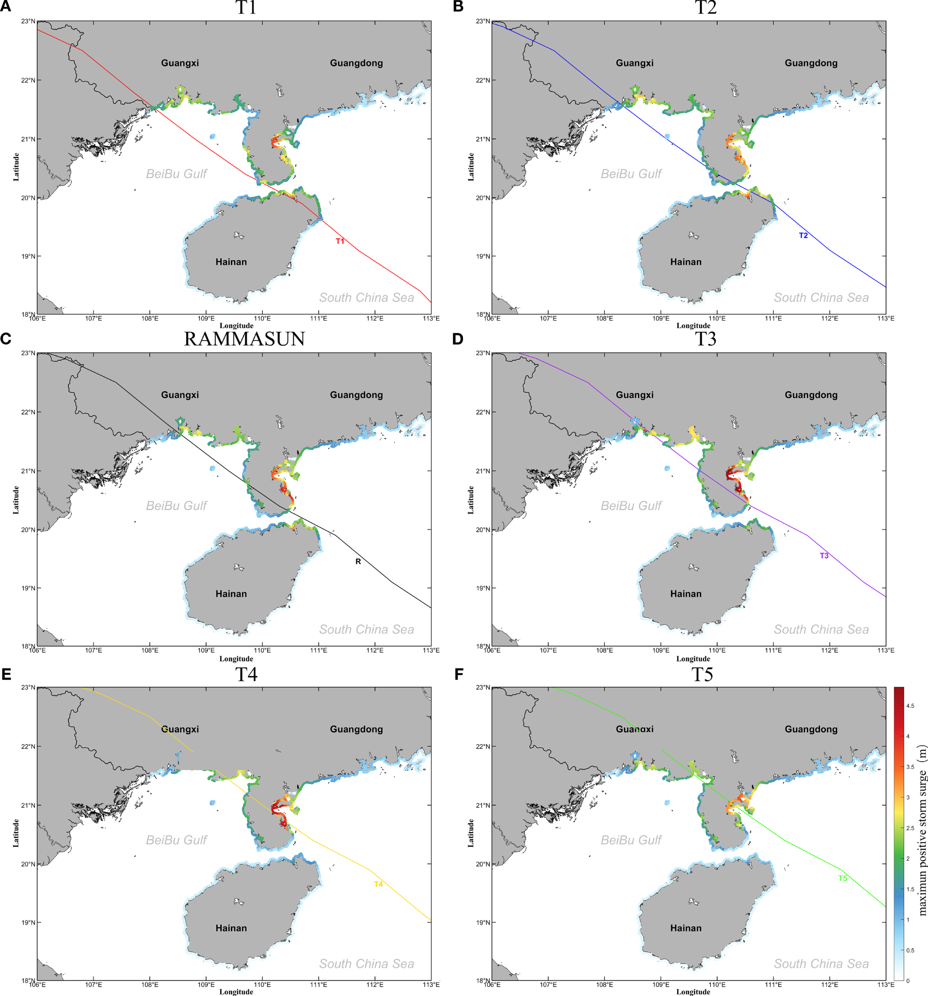 Maps showing spatial distribution of maximum positive surges in the northern South China Sea during typhoons with different tracks. (A) T1, (B) T2, (C) RAMMASUN, (D) T3, (E) T4, (F) T5.