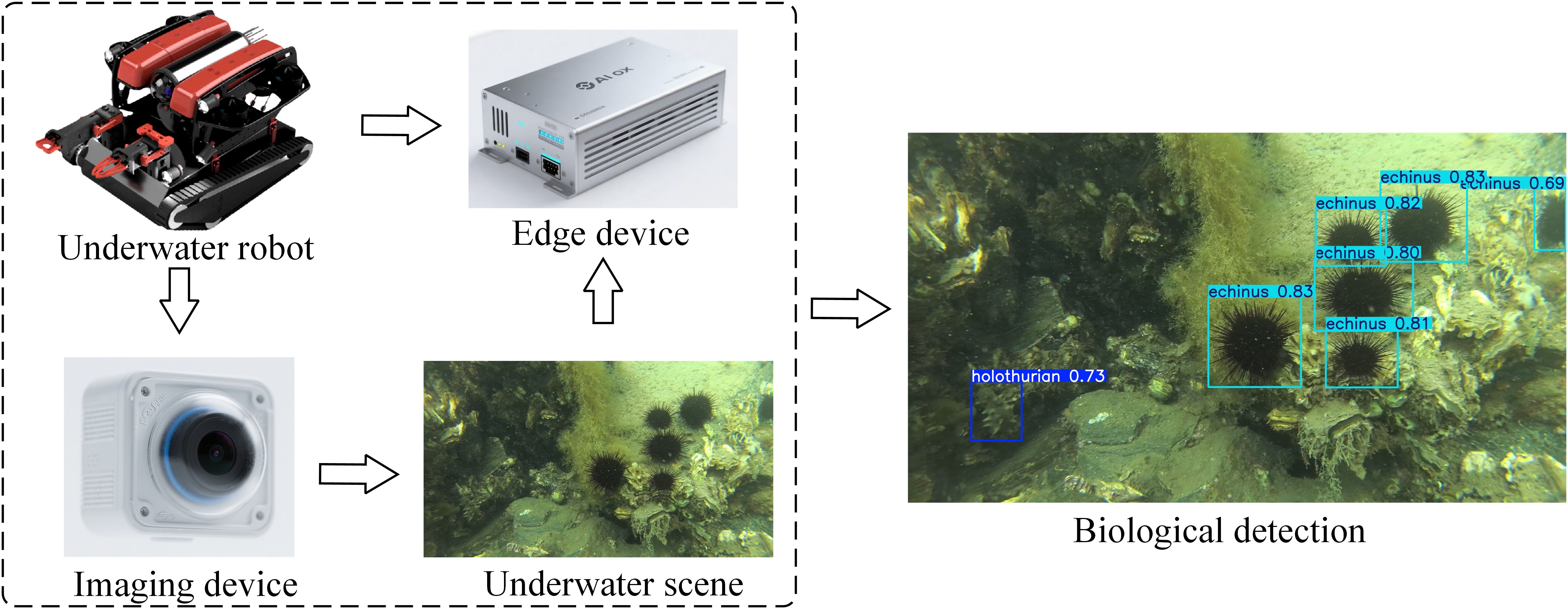 Underwater target detection is a key technical means to realize the exploration of marine resources and promote the practice of marine engineering (Wang et al., 2024; Li et al., 2025). The underwater robot operates autonomously in different underwater environments through optical imaging devices and edge computing devices to accomplish the task of monitoring underwater biological targets, as shown in Figure 1. In particular, in the protection of rare and endangered species, underwater robots can utilize their advanced sensors and imaging technology to detect and count organisms, thus grasping the changes in population size and providing a scientific basis for protection work. However, robots are in motion during underwater exploration, and it is difficult to obtain visually clear images, making accurate detection of underwater organisms still a significant technical bottleneck (Zheng et al., 2023).