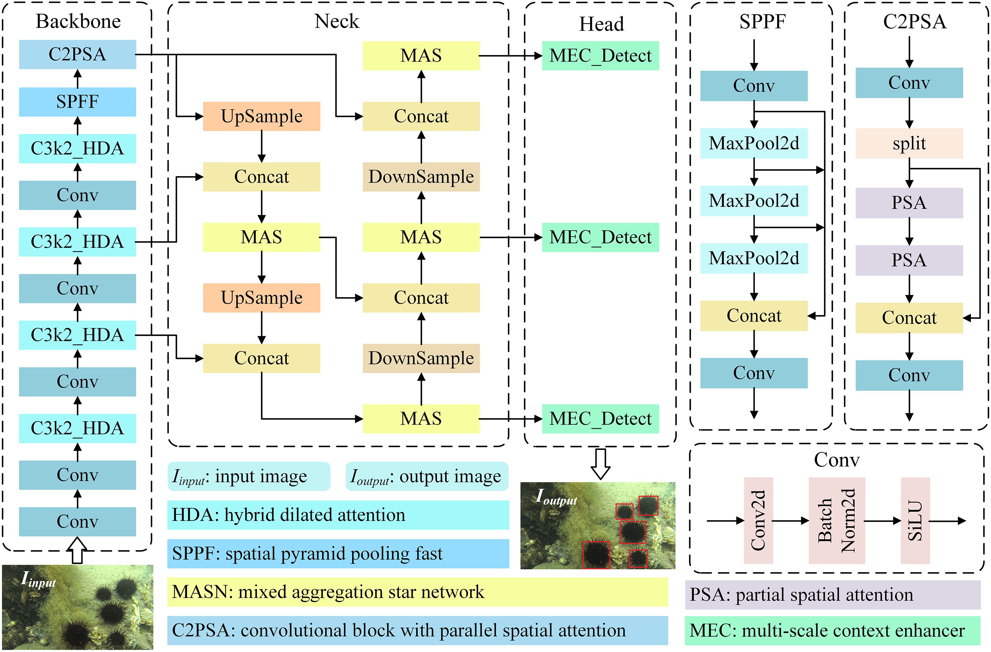 Given the computational limitations of underwater robotic platforms, we selected the YOLOv11 network as the foundational model for our algorithm. Although not the latest iteration of the YOLO architecture, YOLOv11 offers a mature deployment toolchain and exhibits low hardware requirements. Therefore, we innovate and optimize the YOLO11 network by combining the characteristics of underwater imaging and propose a lightweight YOLO network for robotic underwater biological detection. Specifically, in the backbone network, the HDA module is combined with the C3k2 module to enhance the model’s ability to capture multi-scale features from underwater organisms. In the neck network, key features of low-contrast underwater organisms are enhanced by introducing the MAS network. In the probe head, the MCE module is used to accurately localize the contours of underwater organisms, effectively solving underwater detection challenges such as size variation, edge blurring, and background interference. The main contributions of this paper are as follows: