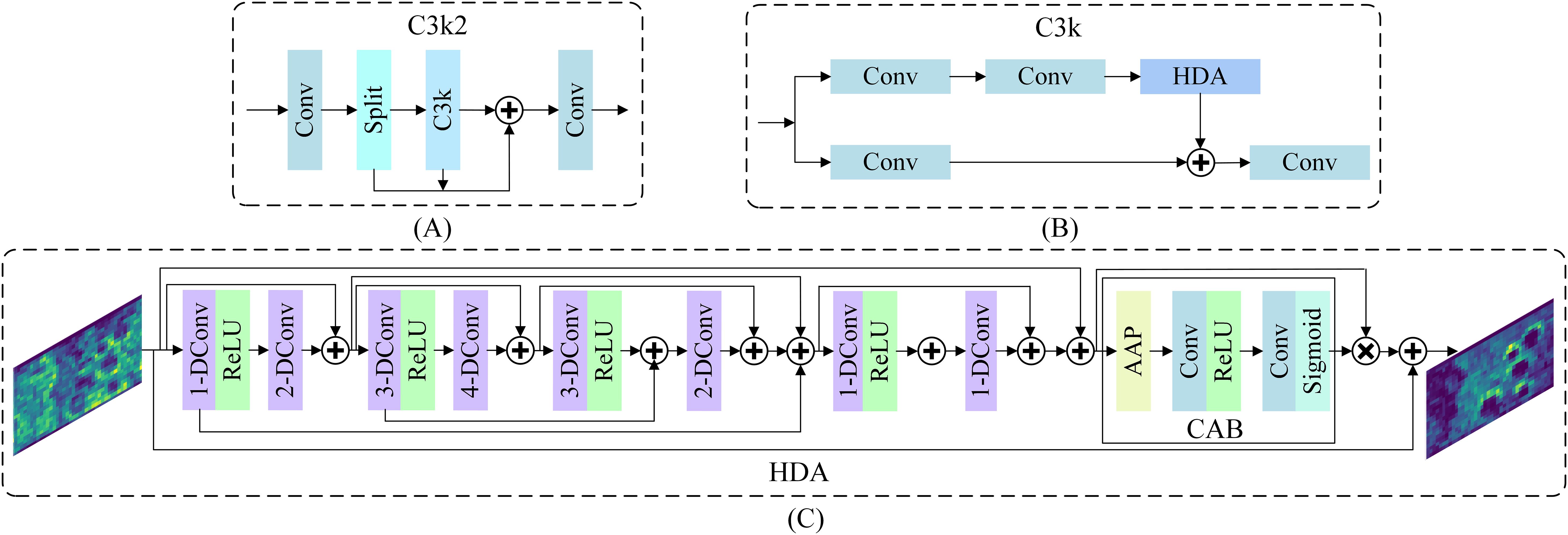 In underwater multi-species, multi-size biological detection, the C3k2 module relies solely on a pure convolutional stacking structure, which cannot dynamically adjust the receptive field, making it difficult to effectively capture the features of underwater targets with different sizes. Moreover, the C3k2 module is difficult to establish global dependencies when extracting local features, and the global relationship between the target and its surroundings in the underwater scene is not taken into account, leading to limited detection accuracy in complex scenes. In this paper, we construct a C3k2_HDA feature extraction module based on hybrid dilated attention. The structure of the C3k2_HDA module is shown in Figure 3, where (A) denotes the C3k2 module, (B) denotes the C3k module, and (C) denotes the HDA module. The C3k2_HDA module is capable of effectively expanding the receptive field and focusing on key features by combining multi-scale hybrid cavity convolution (DConv), channel attention block (CAB), and lightweight residual connectivity to extract multi-scale feature information of underwater organisms.