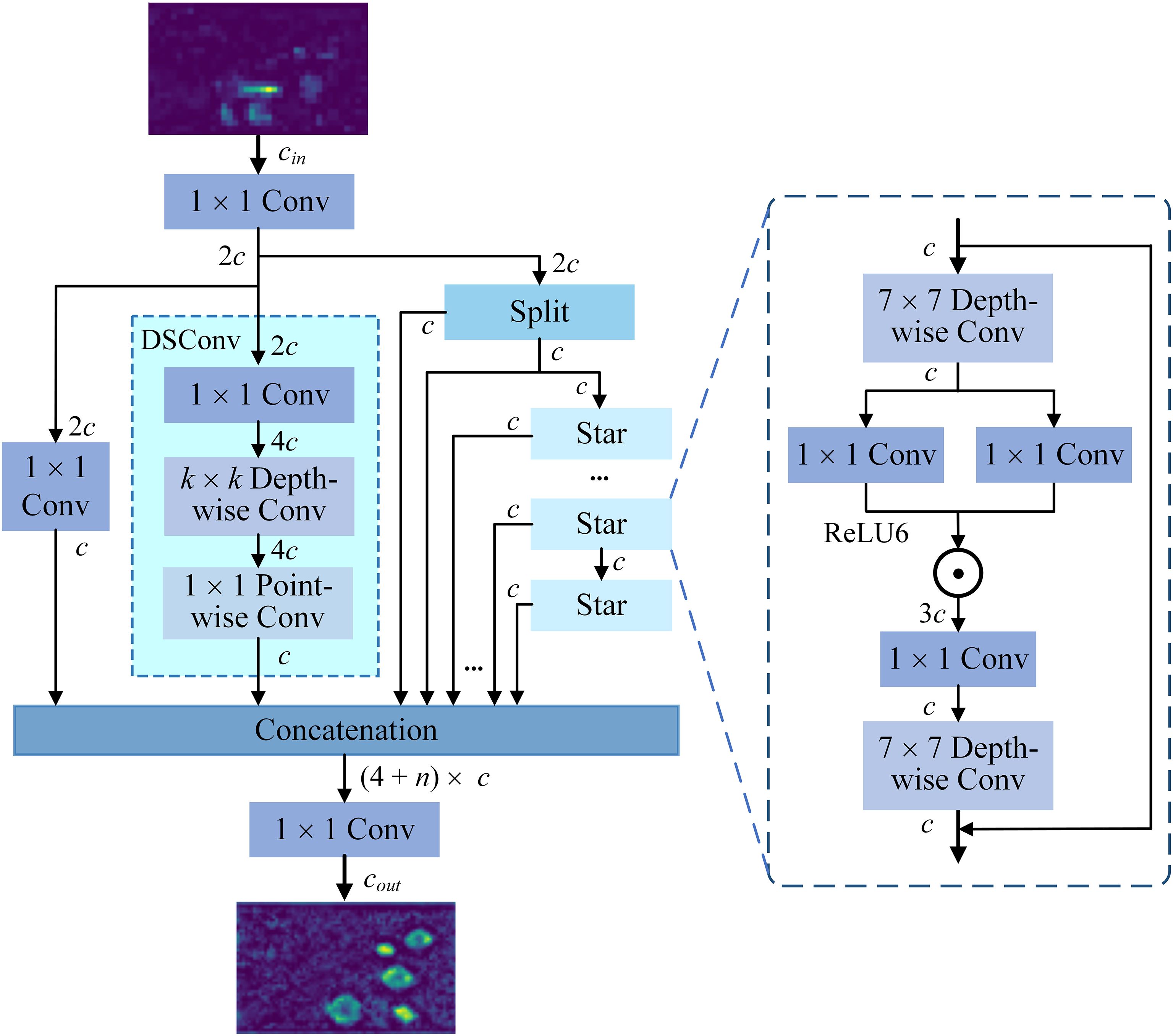 ● To construct different-sized feature dependencies, the MAS network for feature fusion is designed. The key features of underwater organisms are adaptively enhanced through the star operation structure and a multi-branch fusion scheme.