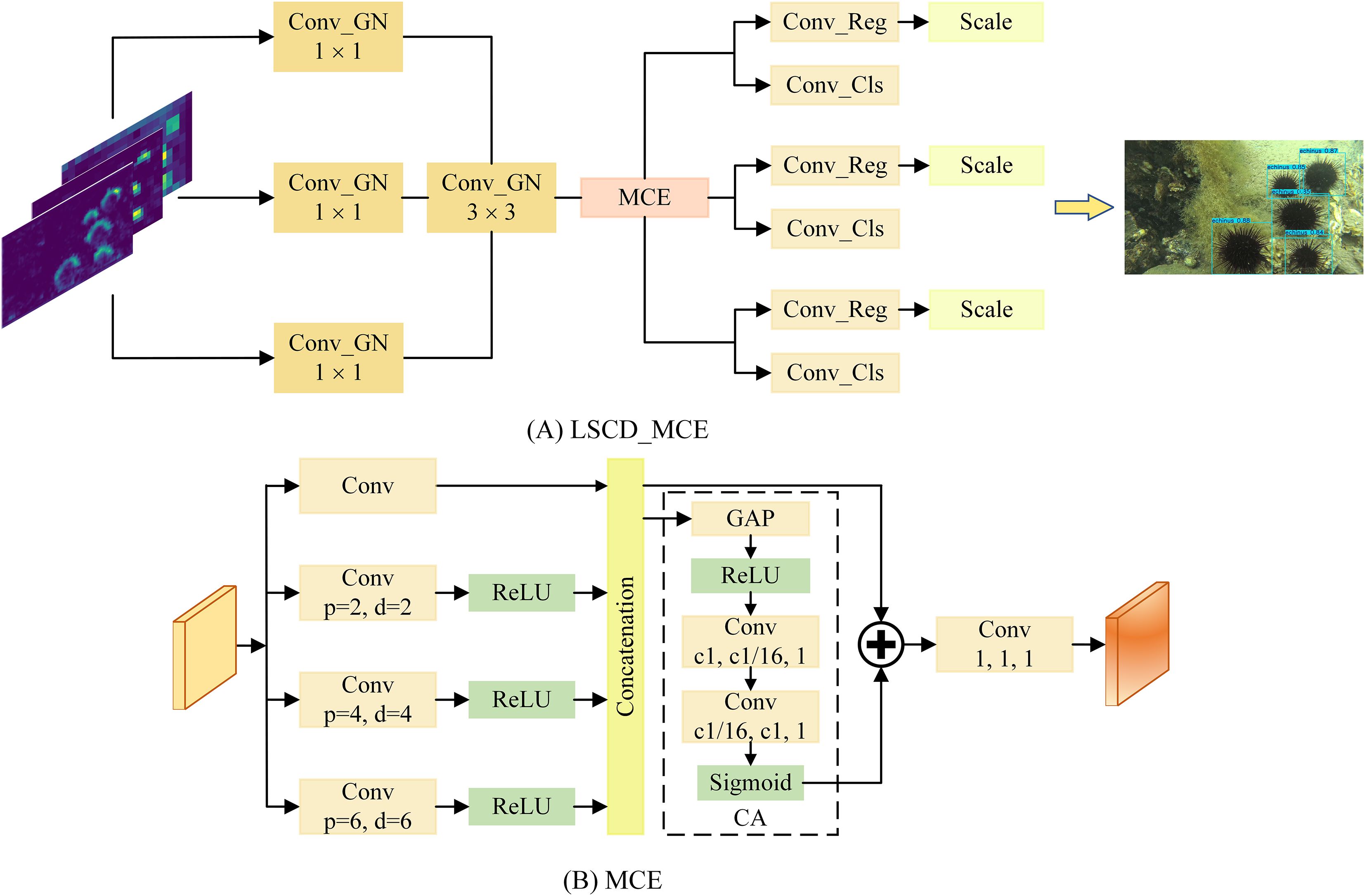 ● A lightweight MCE module for feature enhancement is proposed to improve the recognition ability of blurred underwater organisms. Through parallel multi-scale expansion of the convolutional structure and a shared parameter mechanism, the blurred features and multi-scale information of underwater organisms are dynamically enhanced.