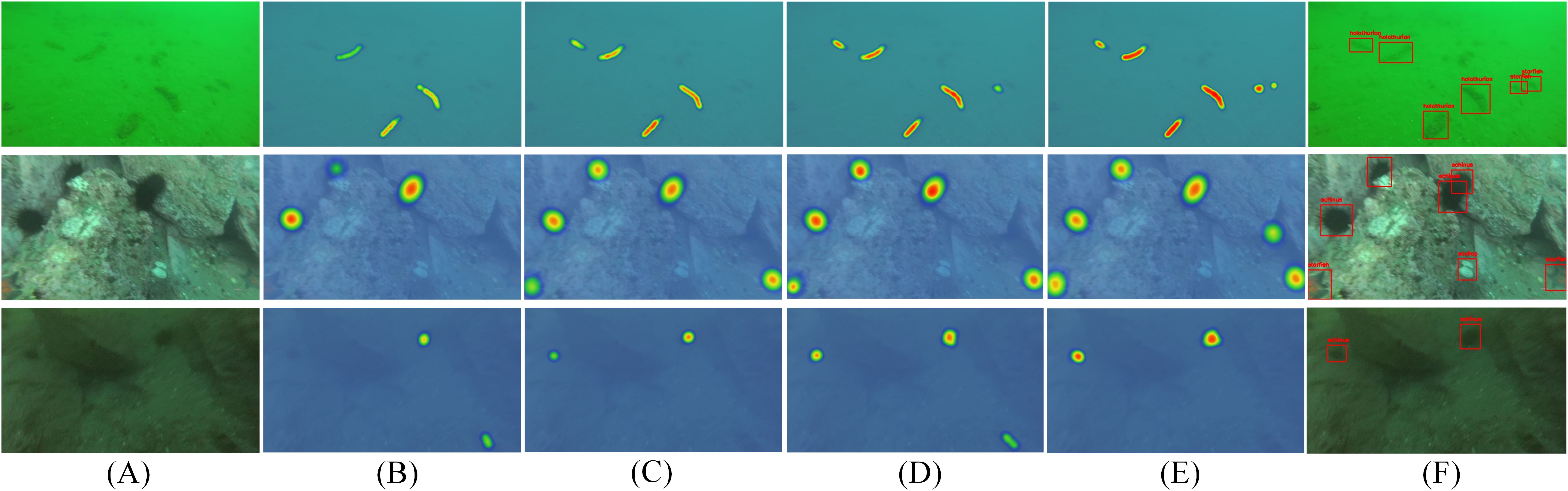 To visualize the effect of innovation points in underwater biological detection, gradient-weighted class-activation mapping is introduced to generate heatmaps for the YOLO11 model and each innovation point. The results are shown in Figure 6, where (a) is the original input image, (b) is the heat map of YOLO11, (c)-(e) are the heat maps generated by introducing the HDA, MAS, and MCE modules, respectively, and (f) is the ground-truth image. The red areas in the heat map indicate that the model contributes more to the detection of underwater organisms. The three groups of images represent color distortion images, normal underwater images, and low-light images, respectively. In images with color distortion, YOLO11 only focuses on objects with a large target scale, missing small-sized targets. On the contrary, after introducing the HDA, MAS, and MCE modules, the model’s attention gradually covered small targets, indicating that the optimized YOLO11 can effectively capture underwater biological features of different scales. In normal underwater images, YOLO11 only focuses on targets with obvious features and omits occluded targets. With the HDA, MAS, and MCE modules, the model not only effectively detects the occluded targets but also can reduce the background interference and successfully detects the starfish with a similar color to the seabed. In low-light images, YOLO11 cannot effectively distinguish the area where the target is located and suffers from detection errors. The proposed method can effectively find out the targets hidden in a low-light environment and realize the accurate detection of organisms.