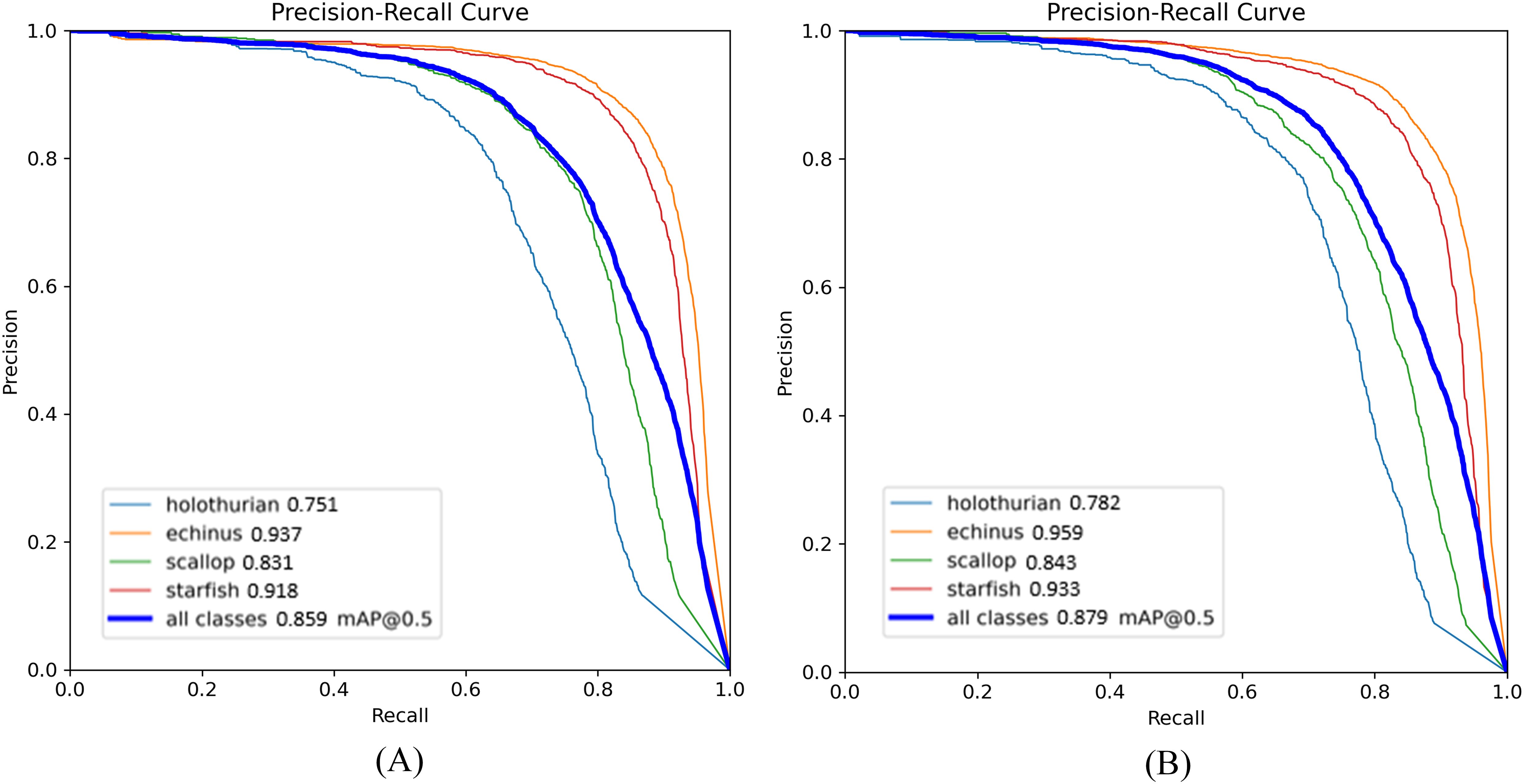 Precision reflects the reliability of the model’s prediction of positive samples of underwater organisms, while recall indicates the probability that the model correctly identifies positive samples of underwater organisms. The calculation of precision and recall can be expressed as Equations 6, 7.