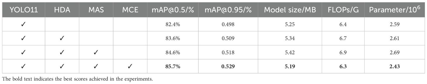 The YOLO11 model, without any innovation point, achieves 82.4% mAP@0.5 and 49.8% mAP@0.95, with a model size of 5.25MB, FLOPs of 6.4G, and a parameter of 2.59×106. After inserting the HDA module into the backbone network, mAP@0.5 and mAP@0.95 improve by 1.2% and 1.1%, but the model size, FLOPs, and parameters increase by 0.09MB, 0.3G, and 0.02×106. After introducing the MAS network in the neck network, mAP@0.5 and mAP@0.95 increased to 84.6% and 51.8%, respectively, with the model size of 5.42 MB, FLOPs of 6.9, and parameters of 2.69×106. After using the MCE module in the head, mAP@0.5 and mAP@0.95 reach 85.7% and 52.9%, respectively, and the model size is only 5.19 M, the FLOPs are 6.3 G, and the parameters are 2.43 M. Therefore, the introduction of the HDA module and MAS network can effectively improve the detection performance of underwater organisms, while the introduction of the MCE module significantly reduces the memory footprint and computational complexity. The proposed method is more favorable for deployment in equipment with limited resources.