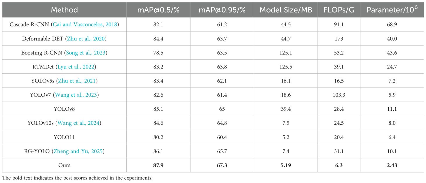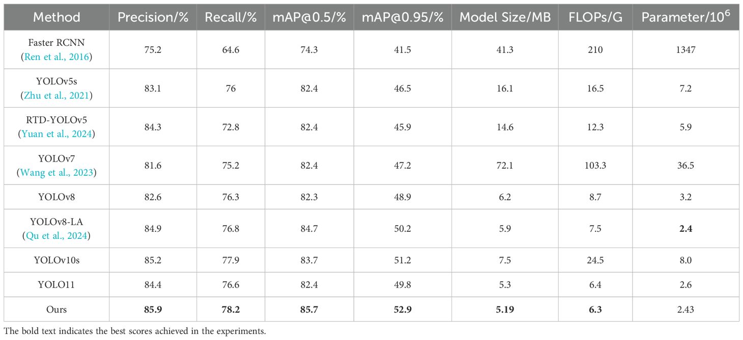 In this paper, the following metrics are introduced: accuracy, recall rate, mAP50, model parameters, model size, and GFLOPs to objectively evaluate the performance of various methods on biological detection in complex underwater scenes (Girshick et al., 2014).