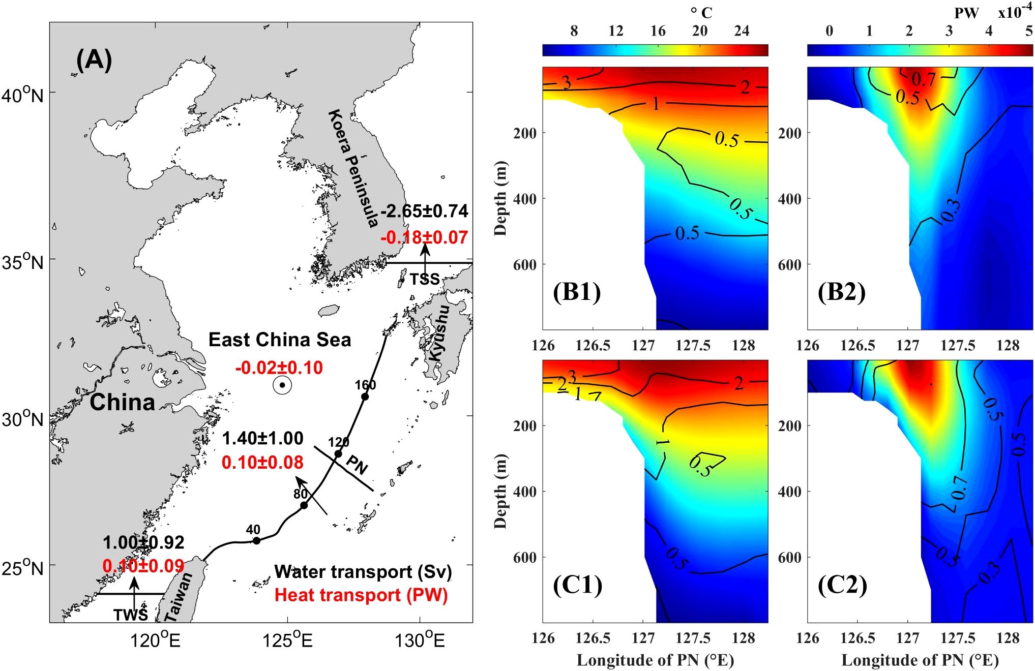 Figure 1. (A) Budgets of water and heat transports in the ECS (negative values represent output), TWS and KTS denote the Taiwan Strait and the Korea/Tsushima Strait, respectively. Shelf points are evenly spaced along the 200 m isobath from northeastern Taiwan to southwestern Kyushu. (B1, C1) Temperature distribution along the PN section. (B2, C2) Heat transport distribution along the PN section. (B1, B2) is based on ARMOR3D; (C1, C2) is based on JMA observations. Background colors represent multi-year averages; contour lines indicate standard deviations.