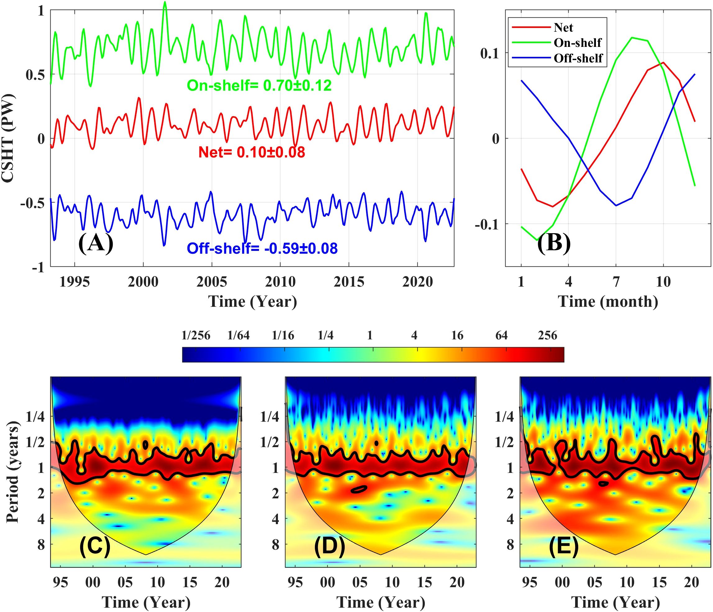 Figure 2. (A) Time series of CSHT. Red, green, and blue lines represent the net, on-shelf, and off-shelf components, respectively. (B) Monthly climatological anomalies of CSHT. (C–E) Wavelet power spectra of the net, on-shelf, and off-shelf components of CSHT. Black contours mark regions exceeding the 5% significance level.