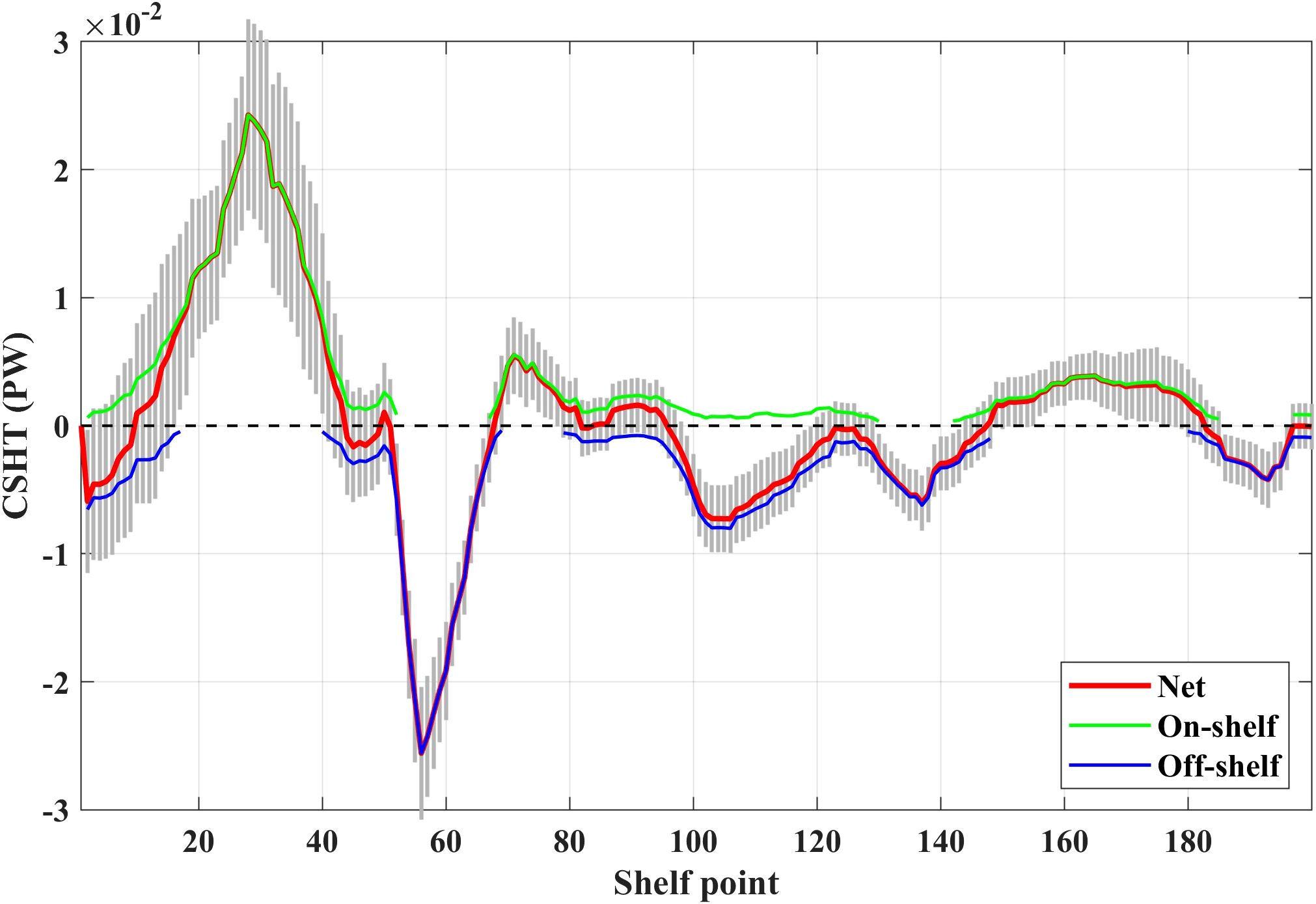 The results of the complete sectional integration (Figure 2A) show that from 1993 to 2022, the total net CSHT was 0.10 ± 0.08 PW, significantly lower in magnitude than its on-shelf and off-shelf components (0.70 ± 0.12 PW and -0.59 ± 0.08 PW). Notably, there is a significant negative correlation between the bidirectional components of CSHT (r = -0.71, p< 0.01), indicating that they tend to strengthen or weaken synchronously. For example, the bidirectional components reached a peak in the summer of 2001 (> 0.1 PW and < -0.8 PW), while dropped to a trough in the winter of 1996 (~0.4 PW and -0.45 PW).