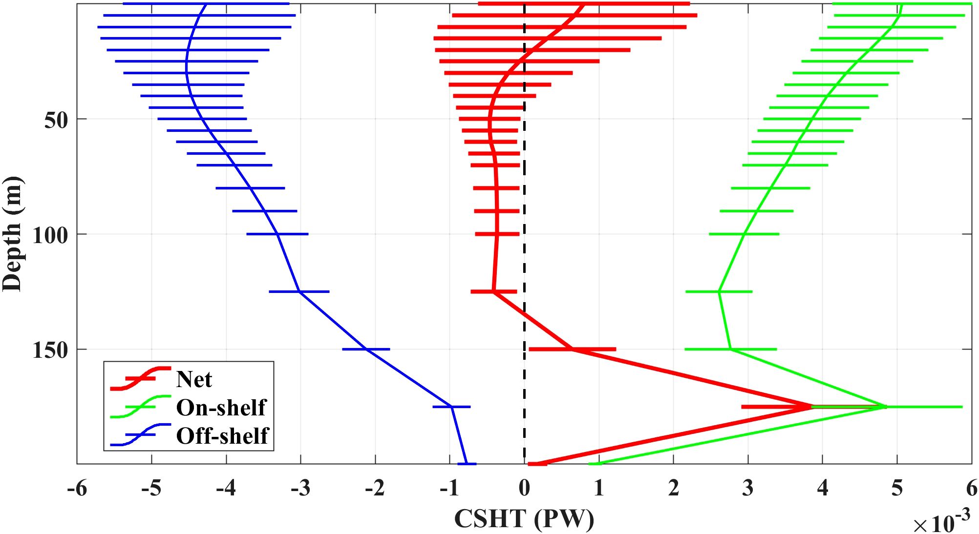 Compared with the horizontal direction, studies on vertical structure of CSHT remain unclear. Tian et al. (2019) suggested on-shelf CSHT in 20 m above and 150 m below, with off-shelf CSHT in between, and the contribution of CSHT decreases with depth. In contrast, Yang (2019) found on-shelf CSHT in surface (0–60 m) and bottom (140–200 m) layers, with unstable patterns in between, and the bottom layer is the dominant contributor to CSHT.