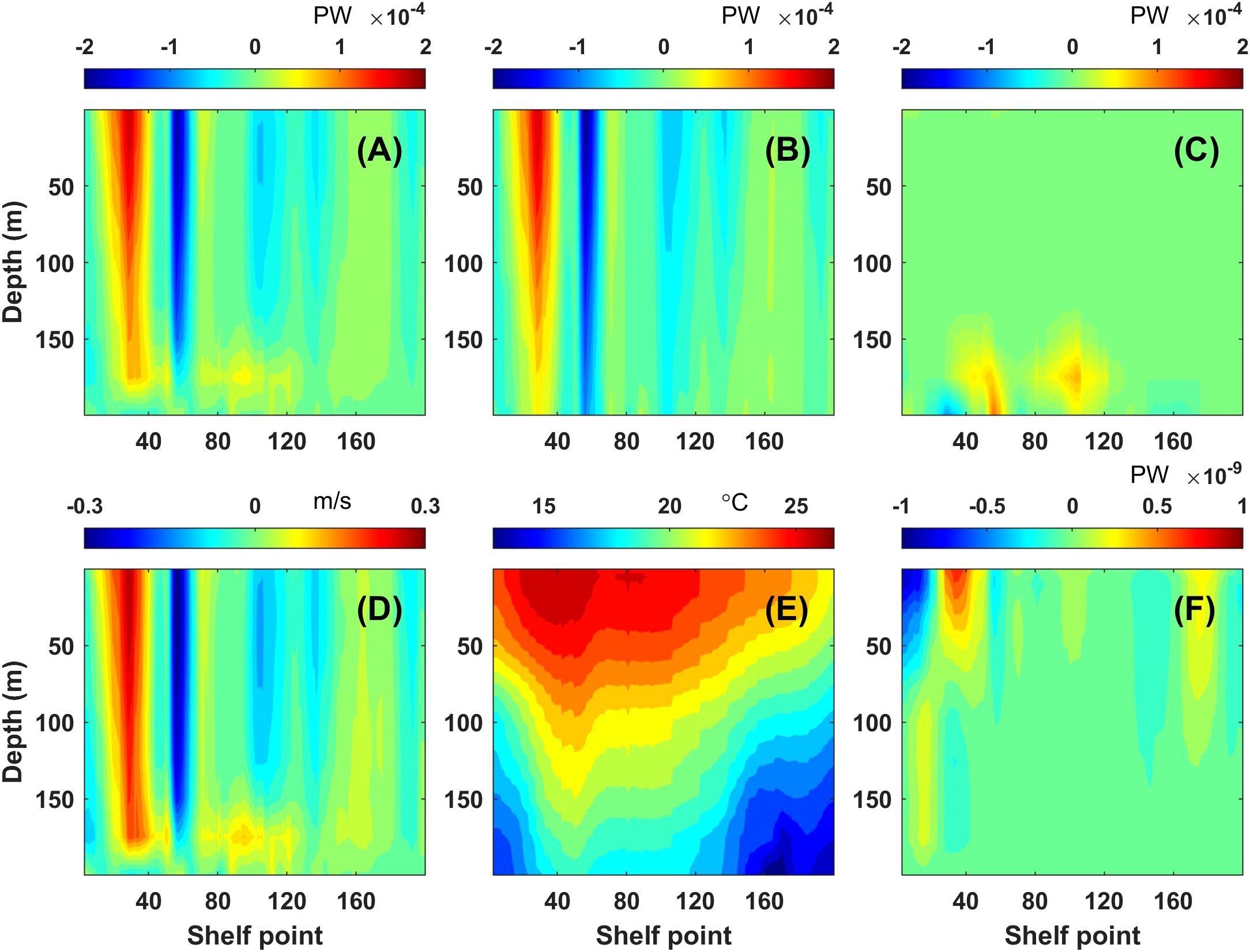 The multi-year averaged distribution of CSHT (Figure 5A) shows that the northeastern Taiwan shelf exhibits a significant upstream on-shelf/downstream off-shelf dipole structure, extending from the surface to the bottom; the central shelf presents a typical double-layer structure, shallow layer above 150 m mainly shows off-shelf heat transport, whereas deep layer below 150 m turns to on-shelf heat transport, but the overall intensity is significantly weaker than that in the northeastern Taiwan shelf; the structure in the southwestern Kyushu shelf is similar to that in the northeastern Taiwan shelf, but with much weaker heat transport. Spatially, the distribution of CSHT closely aligns with the cross-shelf current velocity (Figure 5D), which is mainly because the direction of CSHT is controlled by the current velocity, whereas temperature only affects its amplitude.