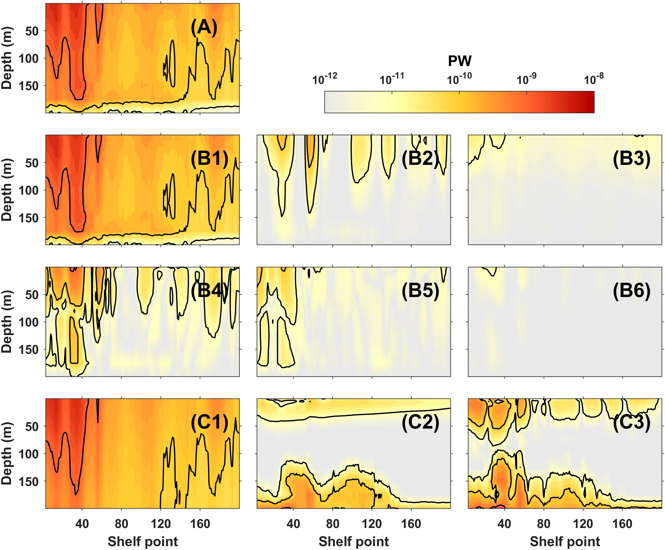 Figure 6. (A) CSHT’s variance. (B1-B6) Components of kinematic variance decomposition, i.e., , , , , , , is all omitted for the convenience of writing, latter the same. (C1-C3) Components of dynamic variance decomposition, i.e., , , . is omitted as a result of the spatial separation between the surface and bottom Ekman components.