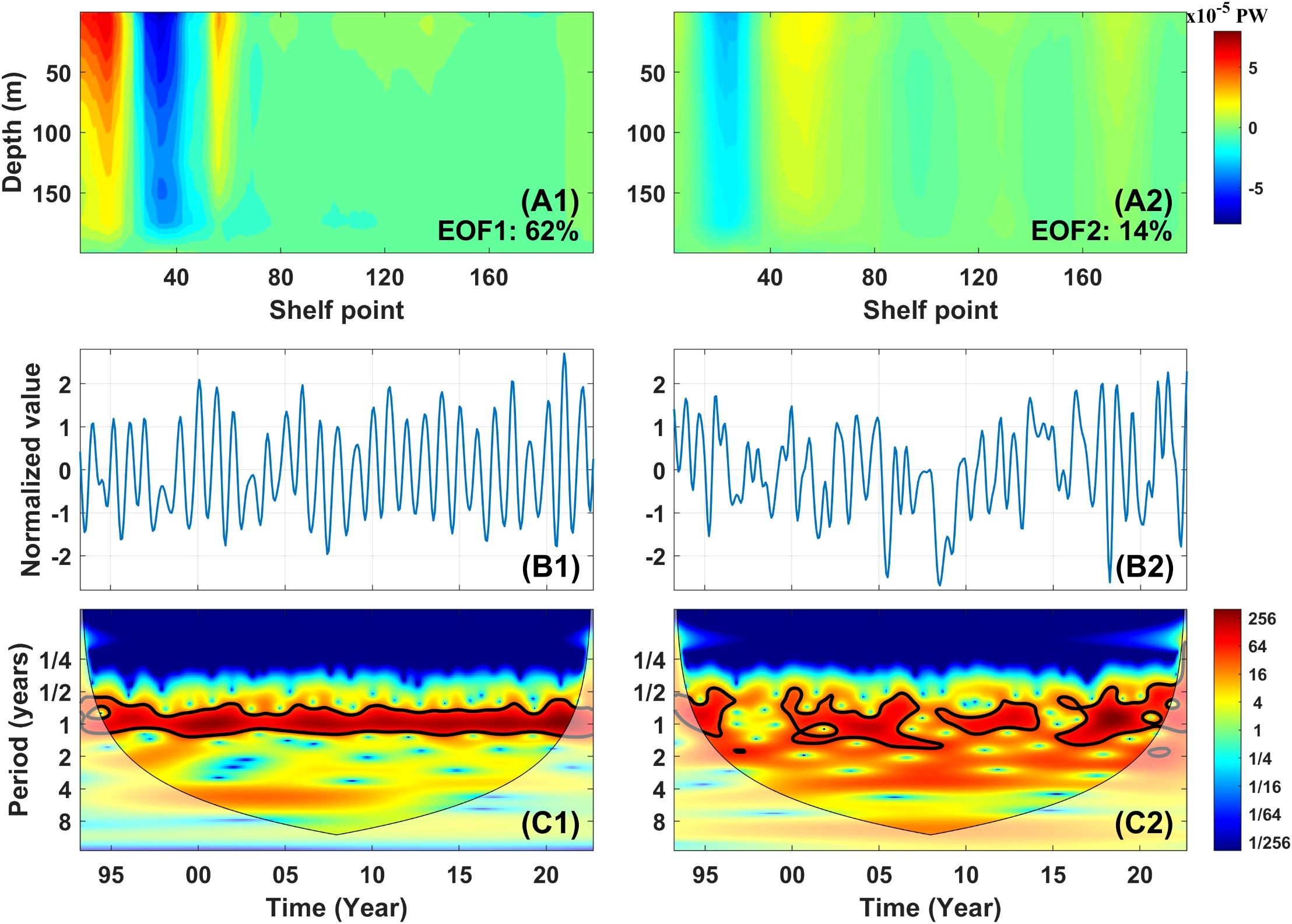 Figure 7. (A1, A2) Spatial patterns of the first and second EOF modes. (B1, B2) Standardized principal components (PC1 and PC2). (C1, C2) Wavelet power spectra of PC1 and PC2. Black contours mark regions exceeding the 5% significance level.
