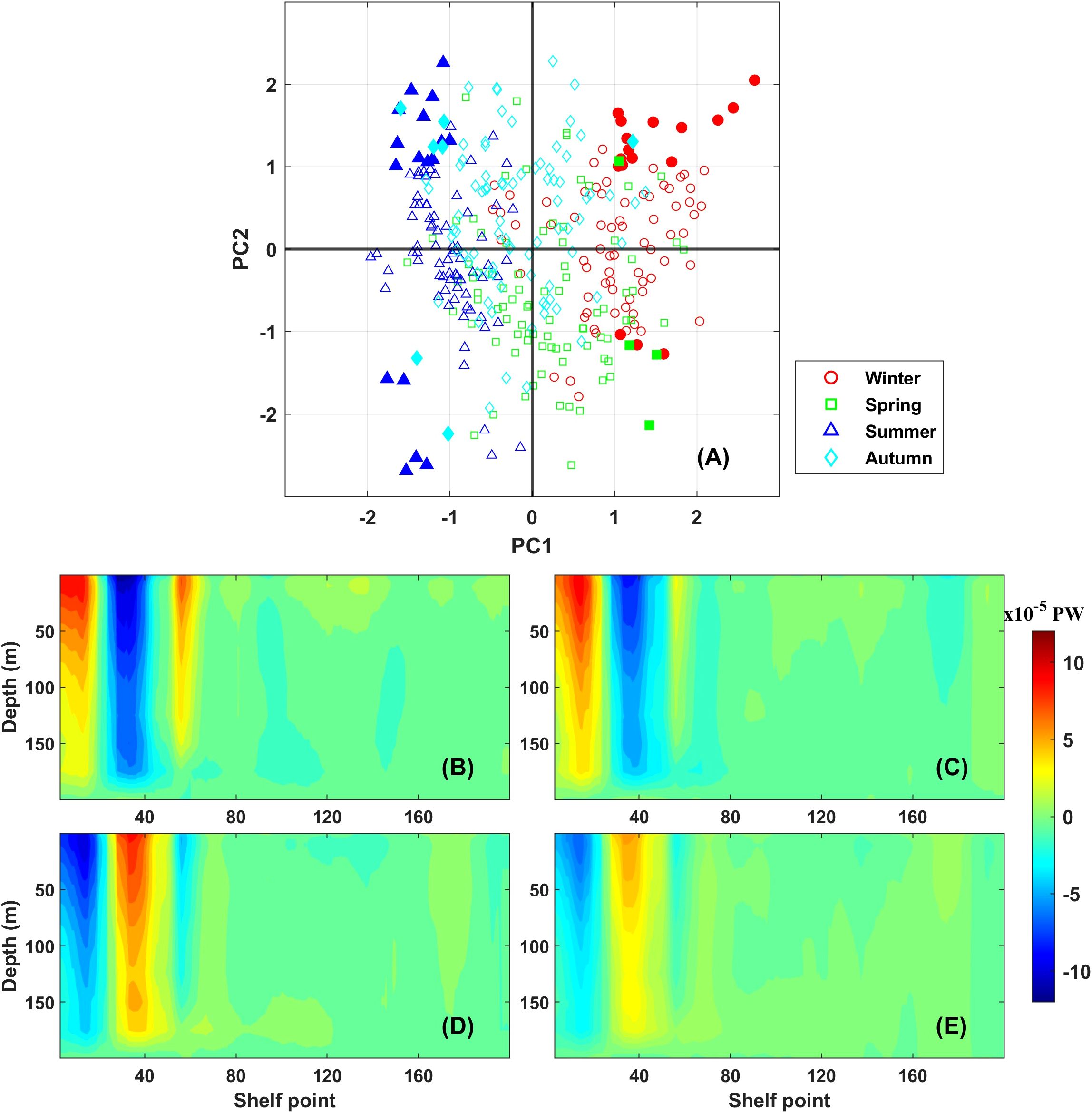 Figure 8. Seasonal reconstructed anomalies based on PC1 and PC2. (A) Scatter plot of PC1 versus PC2. The solid dots represent data points where the absolute values of both PCs exceed one standard deviation. (B–E) The spatial patterns of the EOF reconstructed for (B) winter, (C) spring, (D) summer, and (E) autumn, based on the data points marked as solid dots in (A).