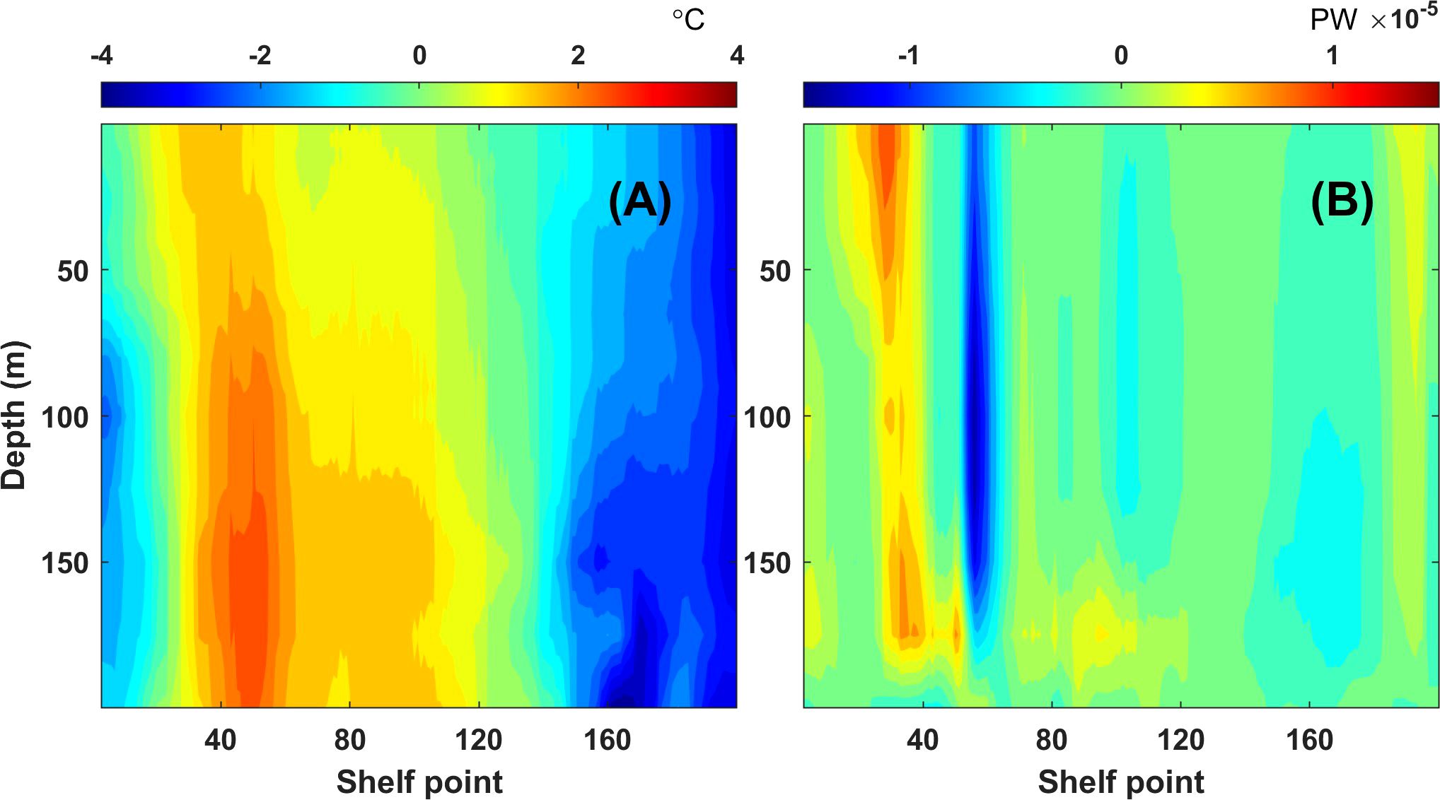 In the Equation 3, denotes the index of the monthly temporal samples used in the summation, with representing the total number of samples (for the monthly series spanning 1993-2022, ; the same applies hereafter). For brevity, the factor is omitted, and is defined as . Among the six components obtained by kinematic decomposition, the first three represent the variance terms of cross-shelf current velocity, shelf temperature, and cross-shelf heat transport disturbance, respectively, and the last three represent their covariance terms. Further dynamic decomposition of is performed: