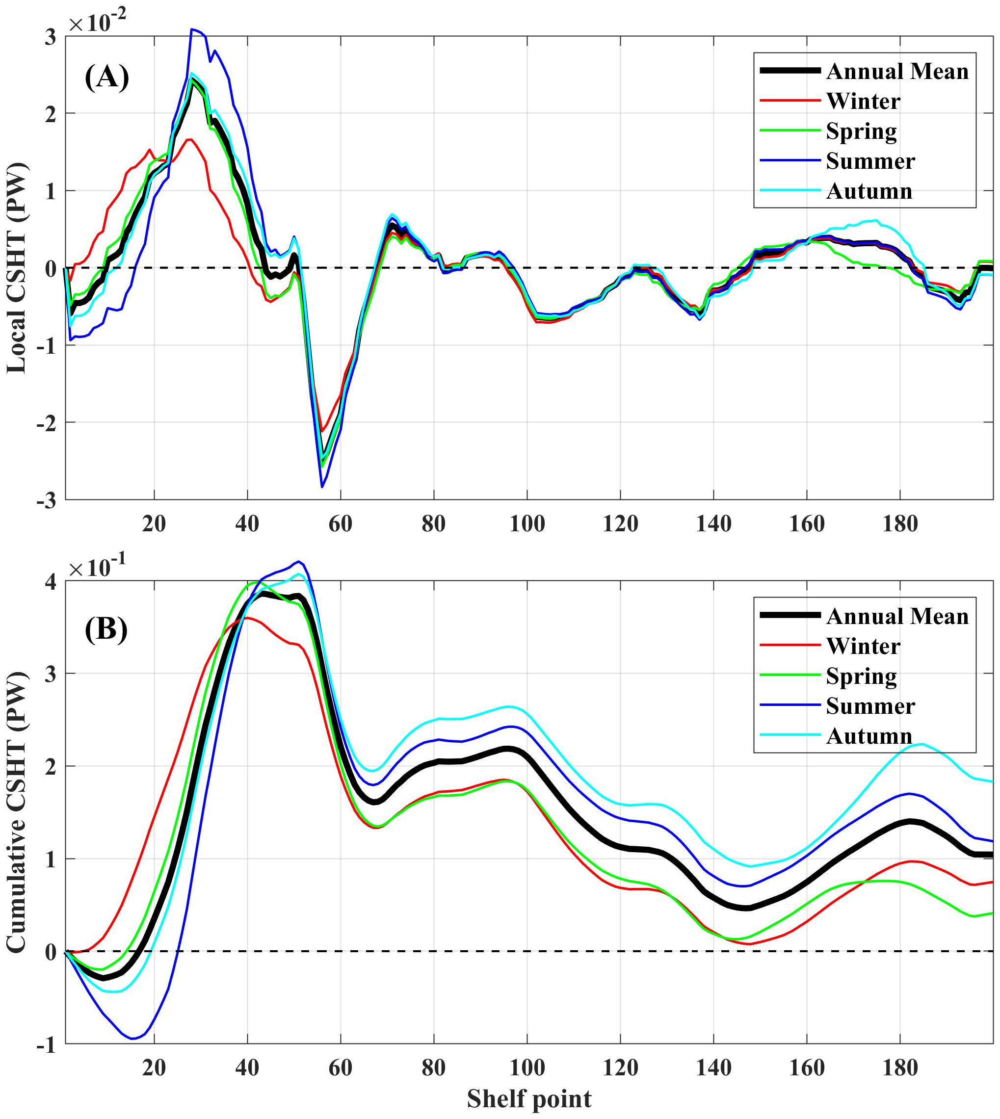 Figure 10. The annual and seasonal averaged CSHT horizontal structure (integrated along the depth). (A) shows the local CSHT at each shelf point; (B) shows the cumulative CSHT along the shelf direction starting from the first shelf point.