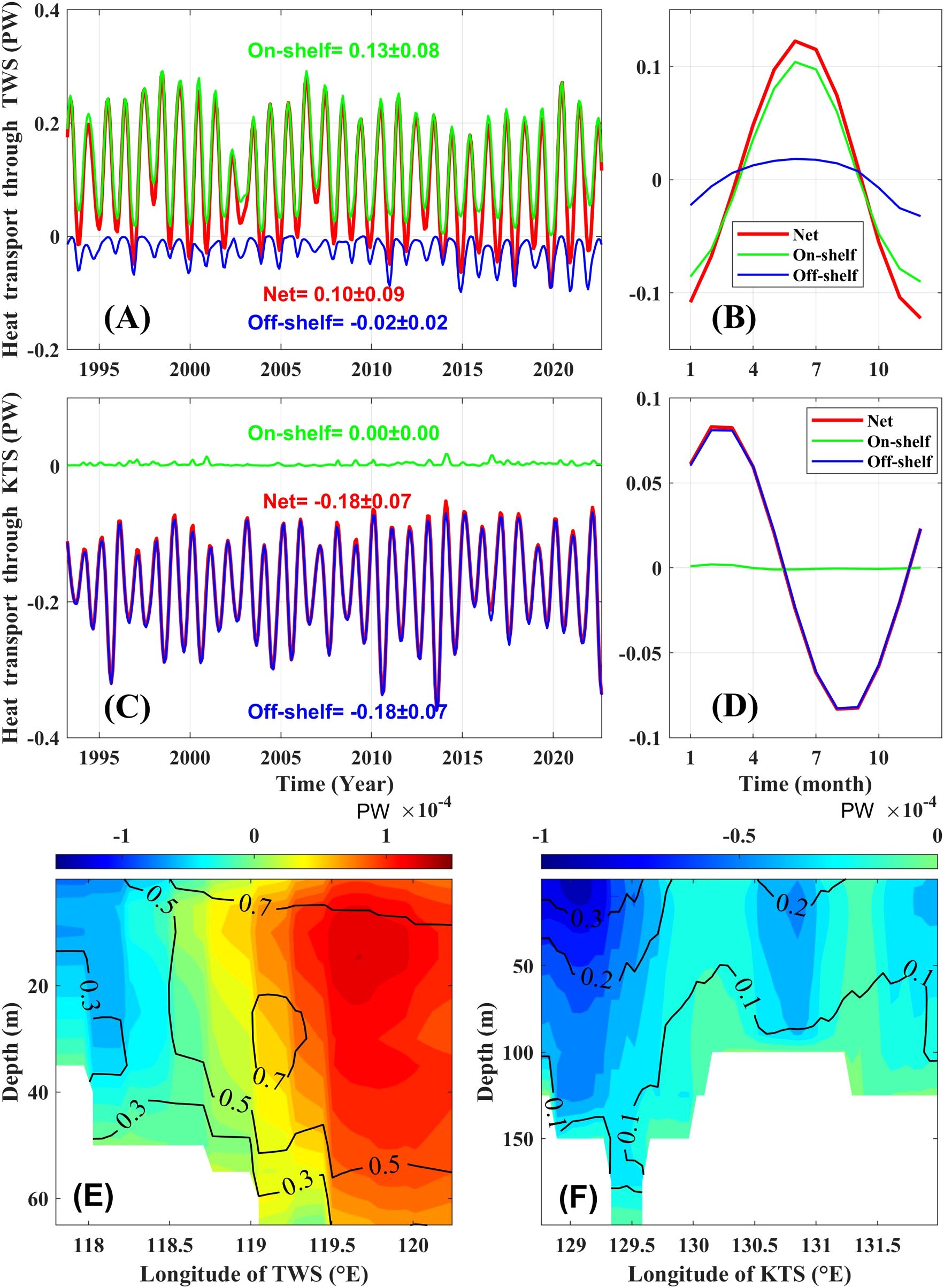Figure 11. Heat transport through the Taiwan Strait (A, B) and the Korea/Tsushima Strait (C, D). Red, green, and blue lines represent the net, on-shelf, and off-shelf components, respectively. Heat transport distribution along the Taiwan Strait (E) and the Korea/Tsushima Strait (F). Background colors represent multi-year averages; contour lines indicate standard deviations.