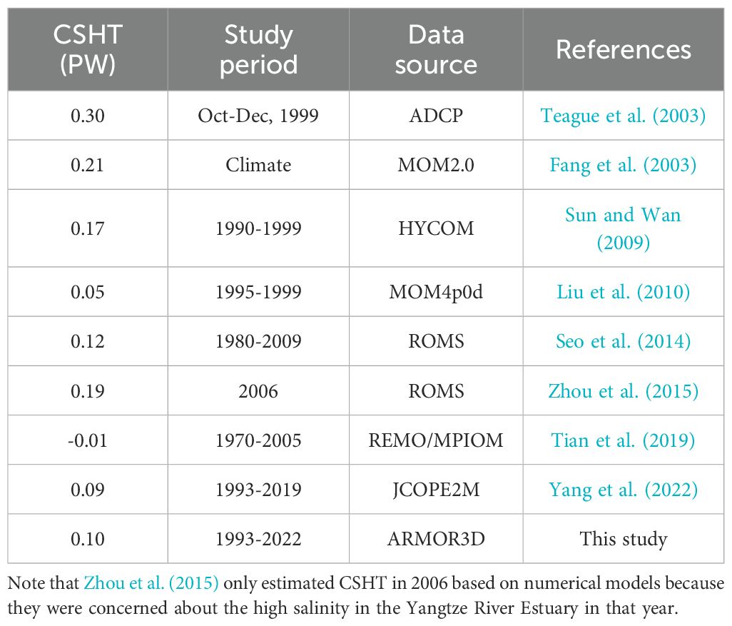 Overall, while previous in situ and modeling studies have provided valuable insights into CSHT, significant challenges remain. These include large discrepancies among model results, an insufficient consideration of bidirectional transport, and uncertainties in the vertical structure, collectively highlighting the lack of long-term observational evidence and a dynamically consistent understanding. Therefore, this study aims to systematically analyze the net and bidirectional CSHT over time and space based on a long-term dataset derived from satellite remote sensing and in situ observations (ARMOR3D), and further investigates the dynamic mechanisms underlying the observed variations.
