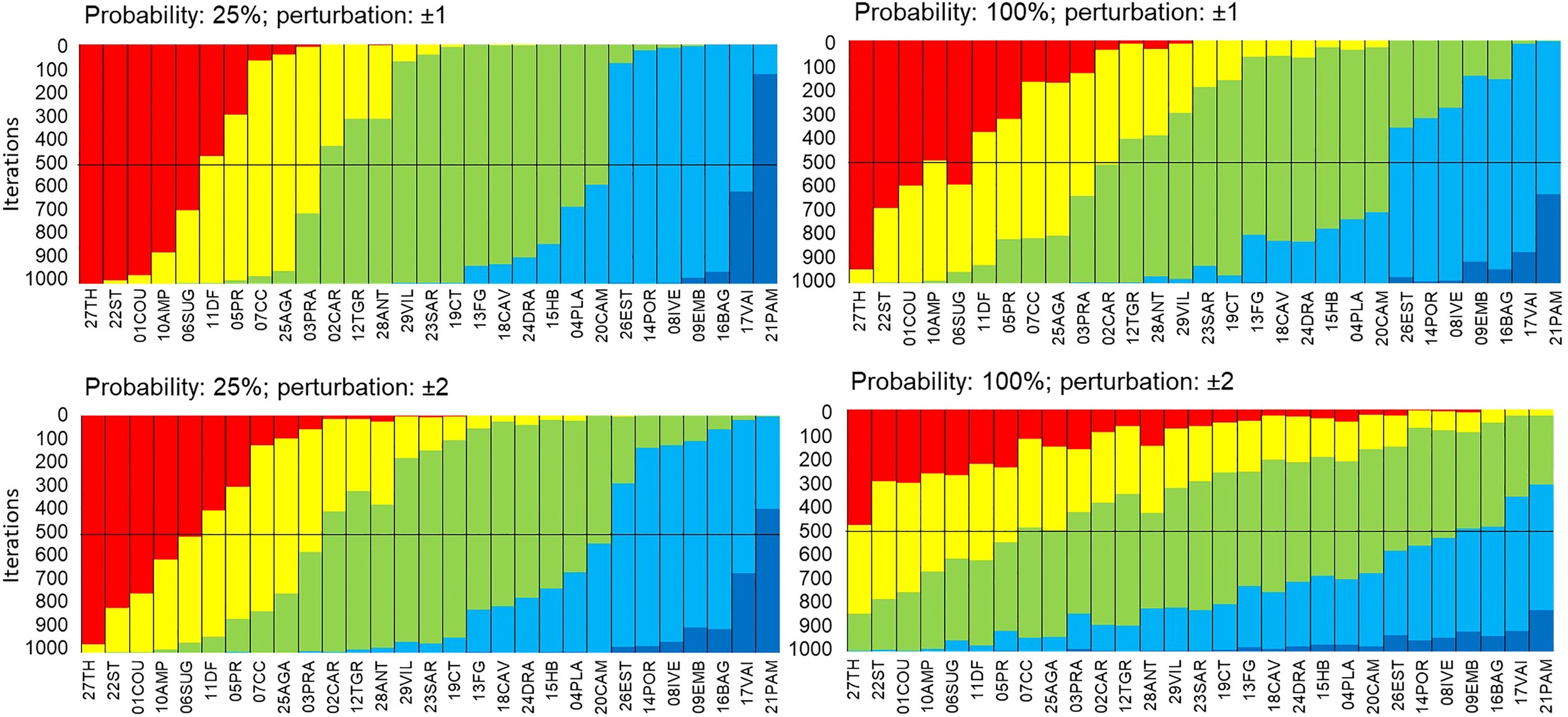 Robustness of the EBQI with regard to the Ecological status per box. Sampling sites (x-axis) are sorted in ascending order according to the EBQI notation from left to right. In order to test the effect of the status per box on the EBQI (robustness), status values have been randomly perturbed (above, ± 1; below, ± 2) 25% (left) and 100% (right) of probability; 1000 iterations were performed. The change of the EBQI notation (Bad through Very Good) of a site, for a given iteration, is shown by the colour of the new class in which it falls). Red: Poor; Yellow: Bad; Green: Intermediate; Blue: Good; Dark Blue: Very Good.