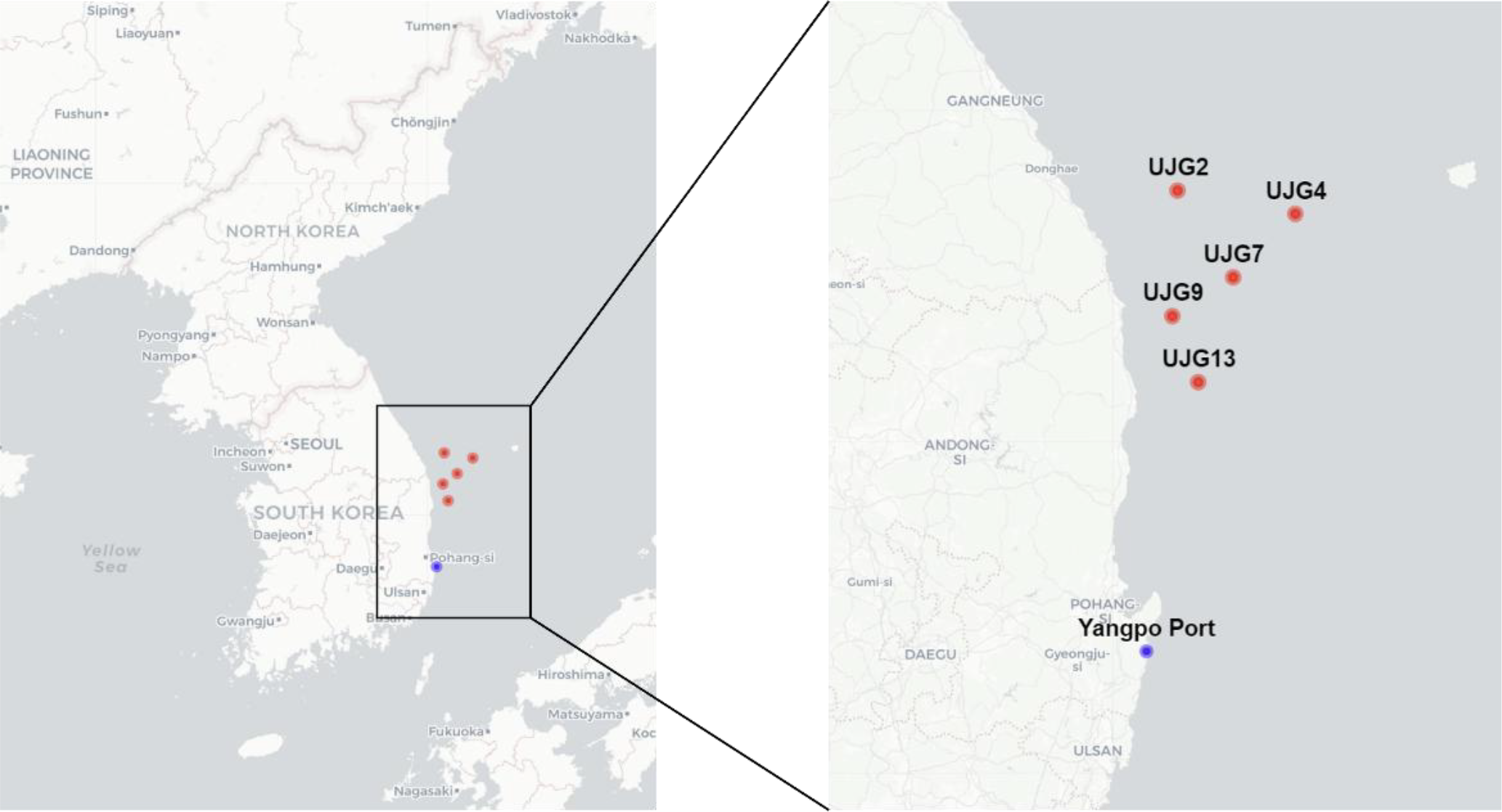Locations of sediment sampling sites in the East Sea (Sea of Japan) of Republic of Korea. Coastal sediment was collected at Yangpo Port (blue dot), and offshore sediments were obtained from five stations (UJG2–UJG13; red dots) along a depth gradient (128–933 m) off the coast of Uljin, Republic of Korea. Offshore samples were retrieved during a 2021 research cruise using a free-fall grab sampler and are archived in the KIOST Marine Sample Library.