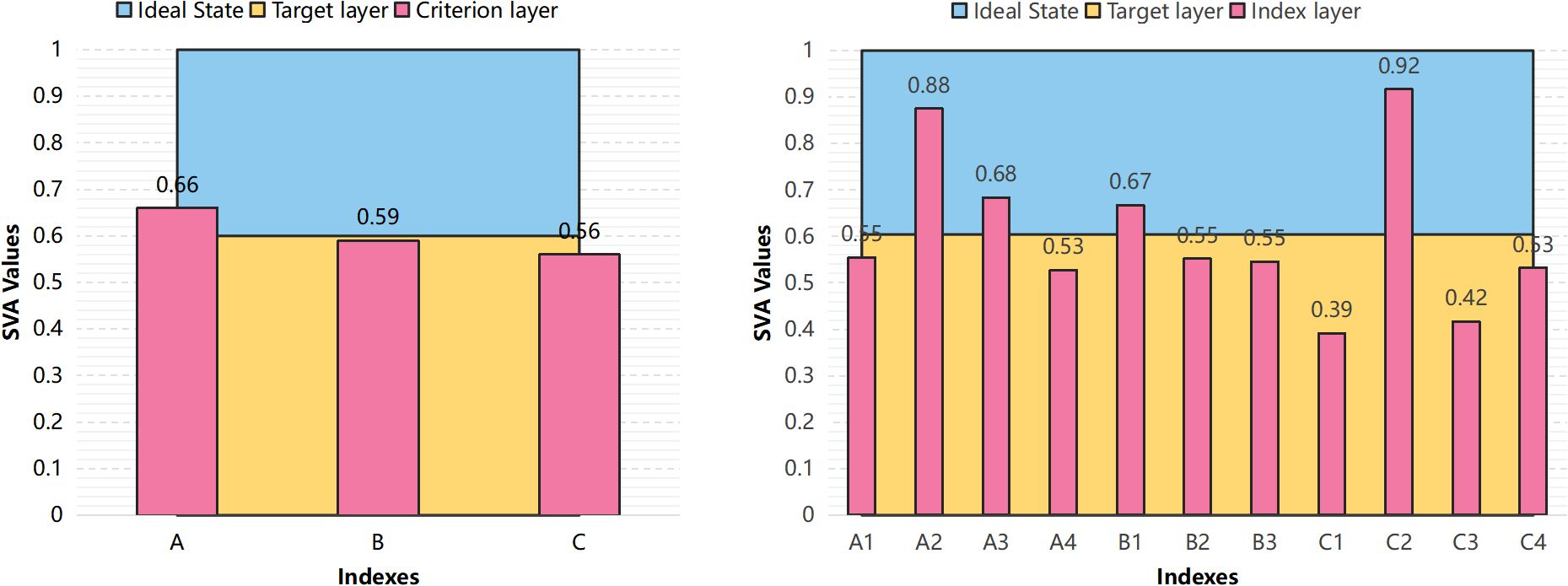 It is important to note that, due to data limitations regarding temporal consistency, our current SVA provides a one-time comprehensive assessment of the present situation in Wuyuan Bay in 2024 and does not reflect annual variations. The results of the SVA show that, overall, the average seashore vitality score (Target layer) of Wuyuan Bay is 0.604, which still indicates a large potential for improvement compared with the ideal state. The environmental vitality (A) of the criterion layers is slightly greater than the average, whereas the social and economic vitality (B and C) are both lower. Specifically, for the index layers, the hydrodynamic (A2) and shoreline use intensity (C2) indices are both far above the average, whereas the sea-use intensity (C1) and marine economic output (C3) indices are both far below the average (Figure 6).