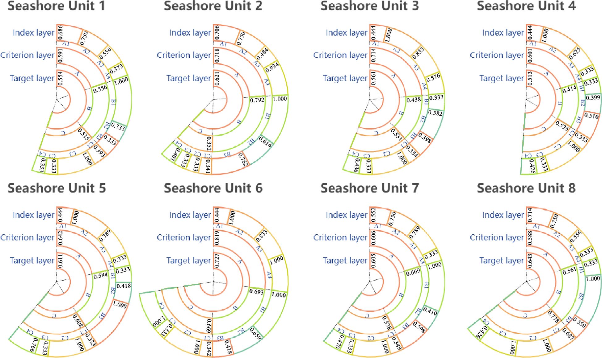 The environmental vitality is highest in Unit 6 (0.819) and lowest in Unit 8 (0.588). In terms of specific indicators, there are large differences in A1 and A4: the water quality of the outer bay seashores (1,2,8), which are directly connected to the sea, is significantly better than the water quality of the inner bay (3,4,5,6,7), where the exchange of water is controlled by the gates. The score of A4 in Units 2 and 6 is approximately 1, whereas that of the remaining units is approximately 0, which is a large difference.
