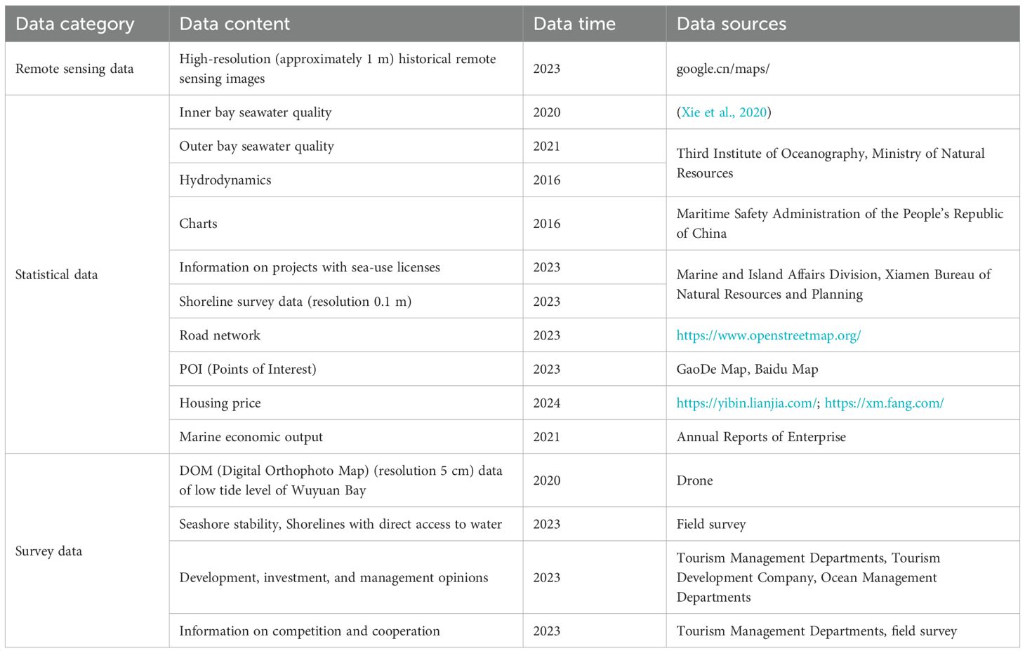 To ensure the contemporary relevance and comprehensiveness of our analysis, we diligently collected up-to-date, multi-source data related to Wuyuan Bay. These datasets included remote sensing imagery, historical documents, drone data, field surveys, and interviews. The specific sources, content, and temporal scope of each dataset are thoroughly documented in Table 1, ensuring transparency and reproducibility.