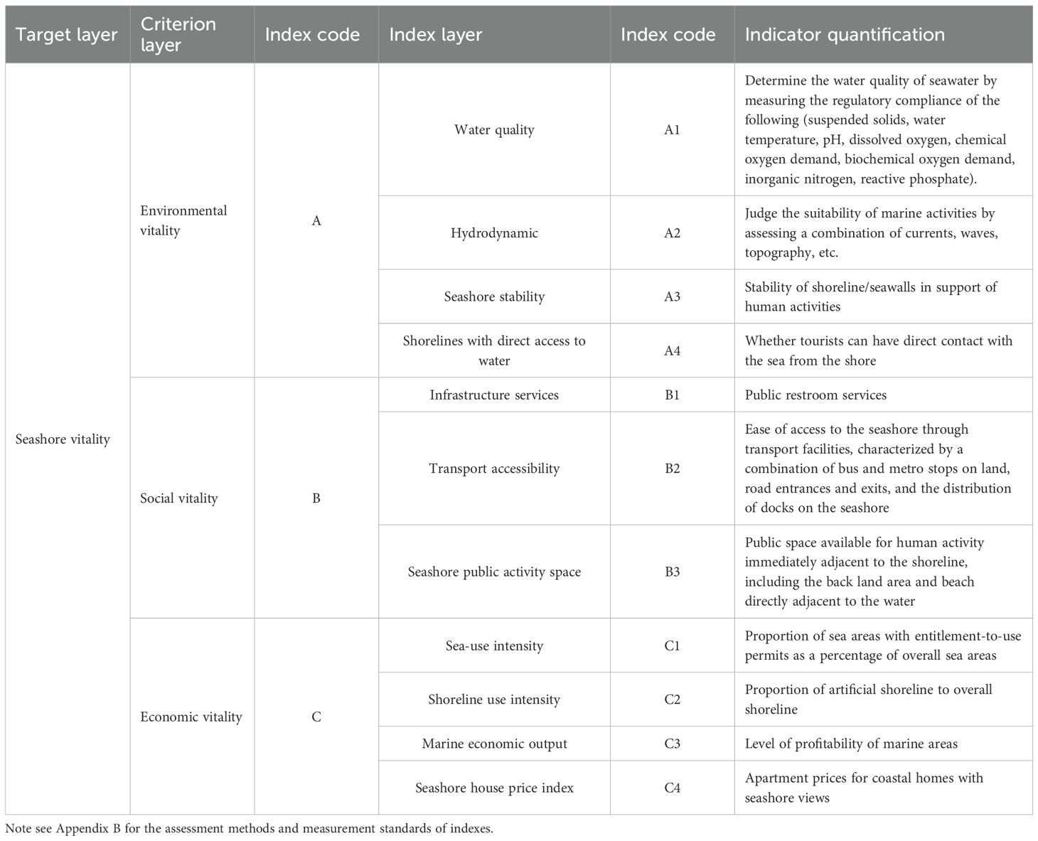 City vitality, as defined by Maas in 1984, is “derived from a variety of unique business and recreational opportunities and a dense social heterogeneous pedestrian population” (Maas, 1984). This concept encapsulates a city’s allure and competitive edge across the environmental, societal, economic, and cultural domains and serves as a catalytic force for its enduring growth in a manner similar to the “blue economy”. In the realm of urban planning, the exploration of land space vitality has been multifaceted, encompassing studies at various scales, e.g., cities (Wang et al., 2022), districts (Gómez-Varo et al., 2022), regions (Meng and Xing, 2019), and streets (Xia et al., 2020). Typically, assessment frameworks are constructed based on evaluations of indicators that represent the economic, social, and environmental systems. The dynamism of coastal areas, particularly those adjacent to the shoreline, is pivotal to broader city vitality, given that nearly half of the world’s cities with populations exceeding one million are located at or near estuaries, tidal river mouths, and approximately two-thirds of the global populace resides within 60 kilometers of the coastline (UNAO, 2016). Seascapes have long been prized, with seaside properties fetching premium prices worldwide (Latinopoulos, 2018). Most previous research has concentrated on riverine or lakeside environments (Fan et al., 2023, 2021; Wu et al., 2019), often treating them as an extension of terrestrial urban areas with limited consideration of the marine dimension. Notably, one study that explored coastal frontages focused solely on terrestrial areas, completely neglecting the intricate interplay with the marine expanse (Huang et al., 2022). This oversight is particularly glaring for coastal cities whose economic, environmental, and social fabric is intrinsically linked to the sea. To address this critical research gap and to provide a more tailored assessment for coastal environments, this study proposes a Seashore Vitality Assessment (SVA) framework. The SVA framework is thus conceptualized as a specialized application and extension of the broader city vitality concept, specifically adapted to capture the unique features and dynamics of coastal zones, encompassing both land-sea interactions and their integrated valuation. This spatially-explicit framework is designed to overcome the limitations of existing blue economy assessment methodologies, particularly by providing a robust, bottom-up approach for evaluating regional blue economy growth. Moreover, its comprehensive perspective offers critical insights that are essential for informing the strategic formulation of MSP initiatives and enhancing the practical implementation pathways for sustainable blue economic development.