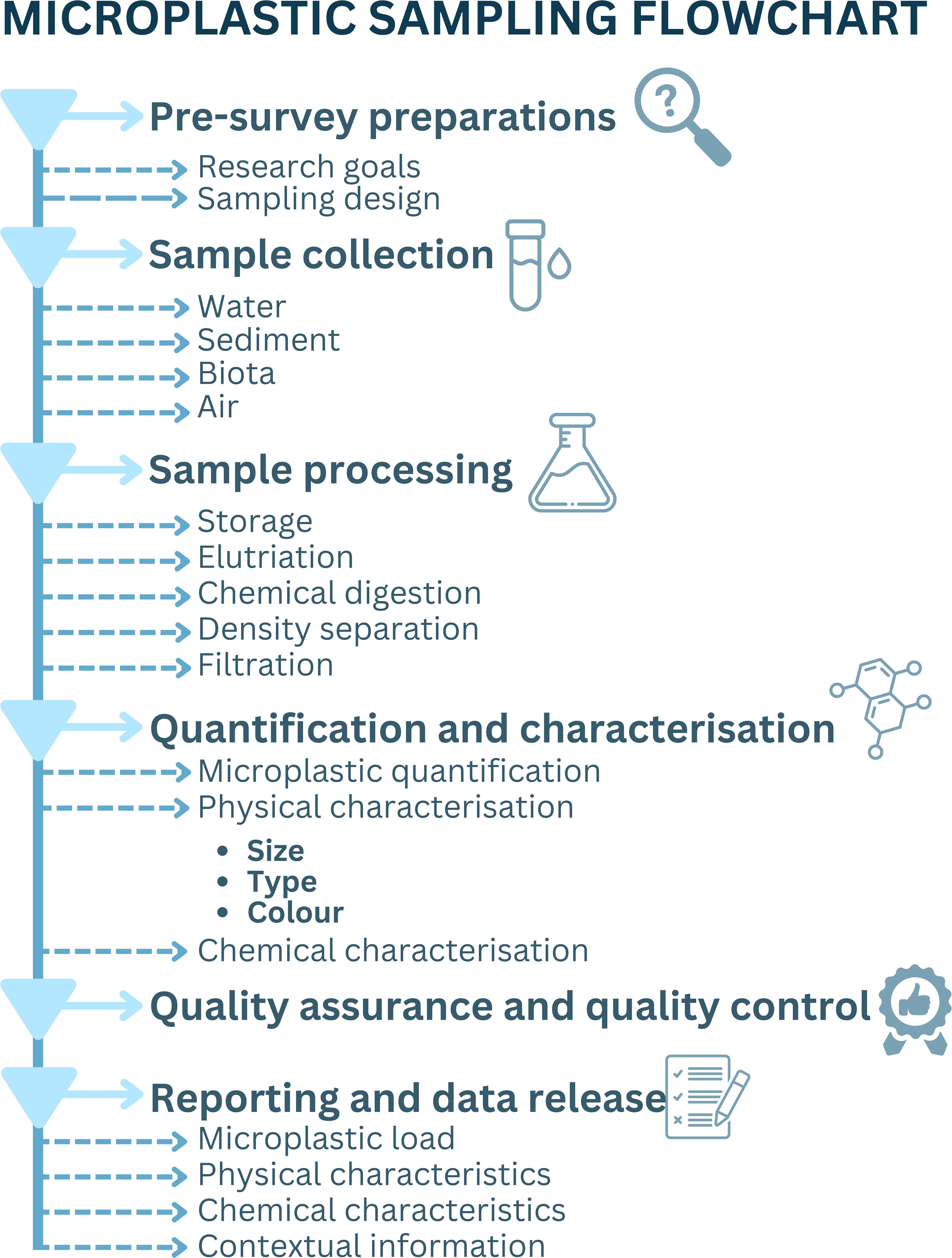 With a strong emphasis on harmonised approaches, and adherence to Findable, Accessible, Interoperable, and Reusable principles (FAIR; Wilkinson et al., 2016) as well as best practice development guidelines (Przeslawski et al., 2023), this paper provides a framework to reduce methodological variations, minimise bias, enhance data accessibility, and facilitate dataset synthesis and comparison. It consolidates and details accepted methods in microplastic research to ensure consistent and comparable datasets now and into the future, supporting the synthesis of regional and global information. Covering microplastics in coastal and marine waters, sediment, biota, and air matrices, this paper spans sampling design, collection, processing, laboratory procedures, plastics characterisation, QA/QC and data reporting (Figure 1). Distinctions are made between essential and desirable reporting parameters, with the essential reporting parameters ensuring, at a minimum, accurate, efficient, and standardised microplastic analysis approaches. These are critical for establishing guidelines across diverse environments. Moreover we provide a checklist for reporting microplastic datasets, essential to supporting scientifically robust and interoperable data comparisons necessary for informed management and regulatory action (e.g., Lusher et al., 2021; Omeyer et al., 2022; Wootton et al., 2024).