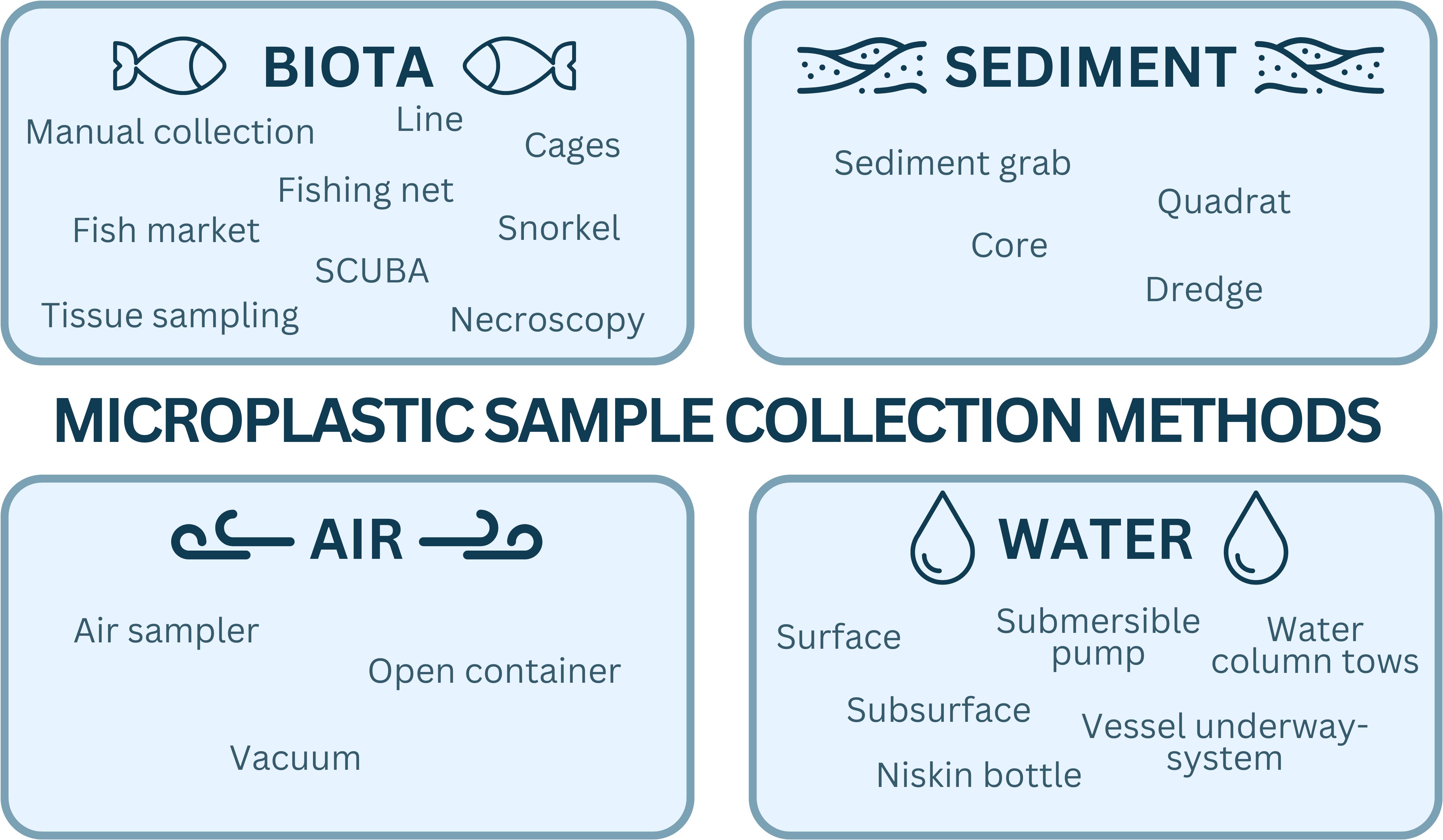 Figure 2. An example of the diversity of collection methods for water, sediment, biota, and air that can be sampled for microplastic analysis.
