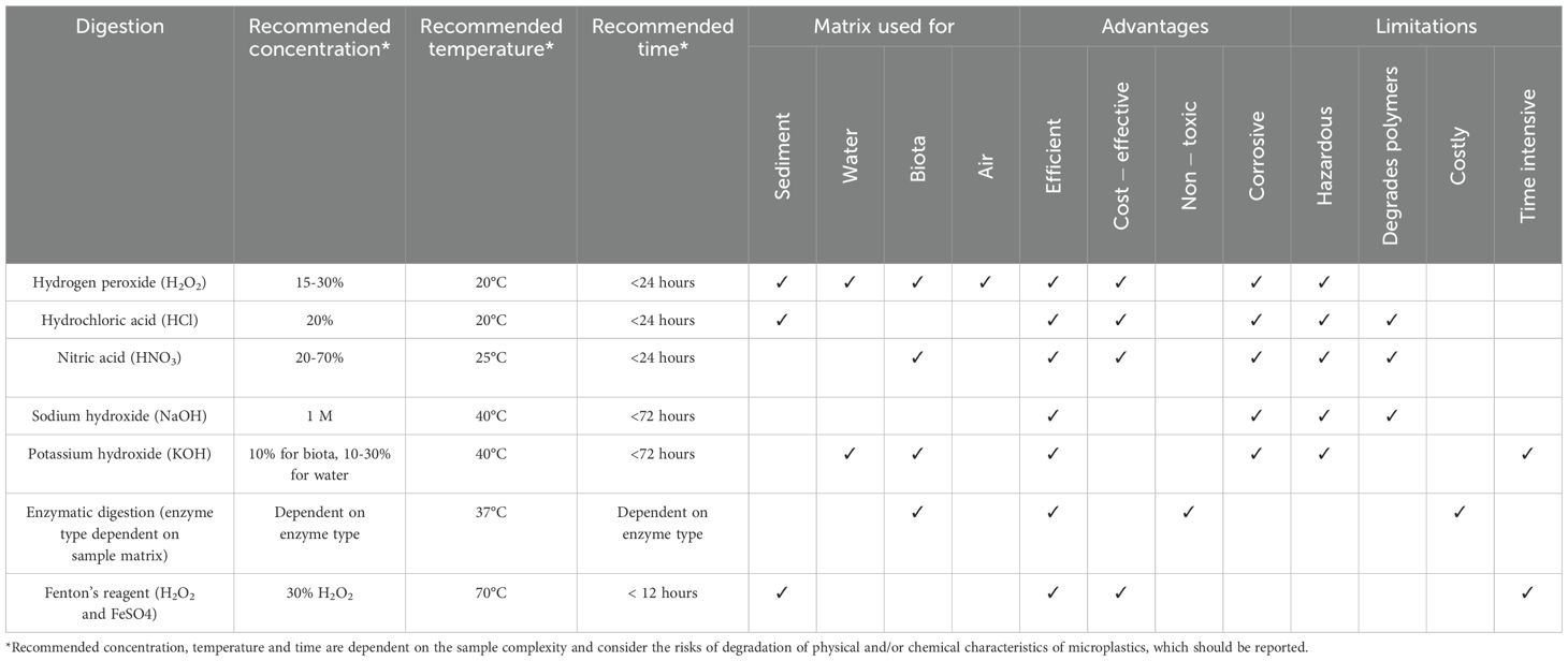 Chemical digestion is recommended to remove organic matter from samples, allowing for better microplastic recovery and facilitating their instrumental analysis. Chemical digestion is commonly used in biota and sediment samples but is generally only necessary in water or air if there is a large amount of organic content. A wide range of different chemicals, from solvents to peroxides, acids, alkalis and enzymes, have been used (e.g., Di Fiore et al., 2024) (Table 1), with digestion efficiency dependent on sample composition, reagent concentration, temperature, activity period (e.g., enzymes), and treatment time. Thus, the type of chemical digestion chosen is often a compromise between multiple factors, including the complexity of the sample matrix and the efficiency of the digestion, its cost, health and safety risks, as well as the potential for physical and/or chemical degradation of different microplastics types and sizes (Di Fiore et al., 2024; Lavers et al., 2019; Miller et al., 2017; Pfeiffer and Fischer, 2020; Santana et al., 2022; Tuuri et al., 2024). It is particularly important to limit the use of heat for the digestion, following the recommended temperatures seen in Table 1, as the chemical composition of microplastics can be altered.
