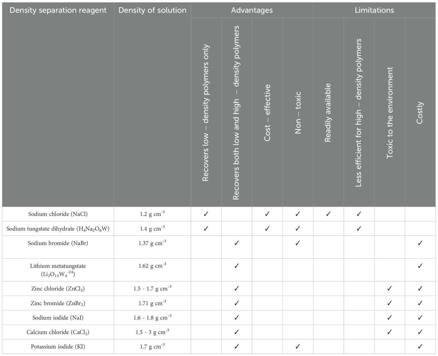 Table 2. Commonly used density separation reagents for microplastics analysis, including their density, main advantages and limitations.