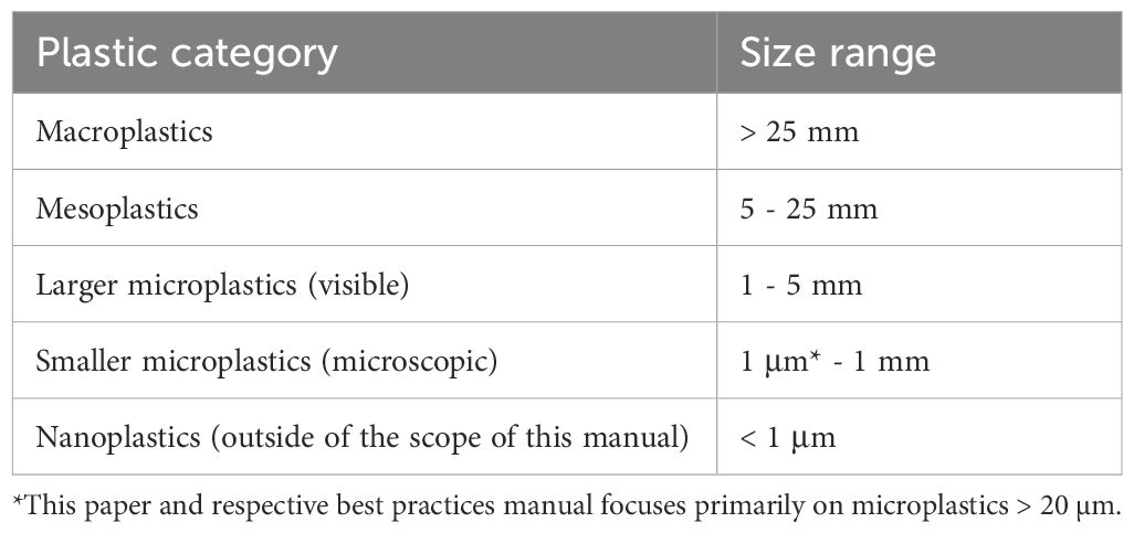 Table 3. Size classifications are used to categorise plastic, from macroplastics (> 25 mm) to microplastics (1 μm* - 5 mm), as well as nanoplastics (< 1 μm), which require specialised procedures for detection.