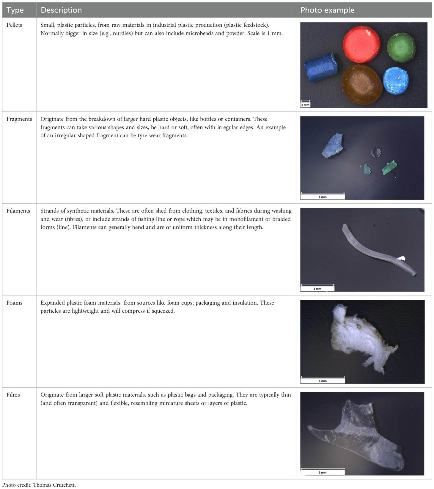 Table 4. Description and classification of various plastic morphologies found in environmental samples, including pellets, fragments, filaments, foams, and films.