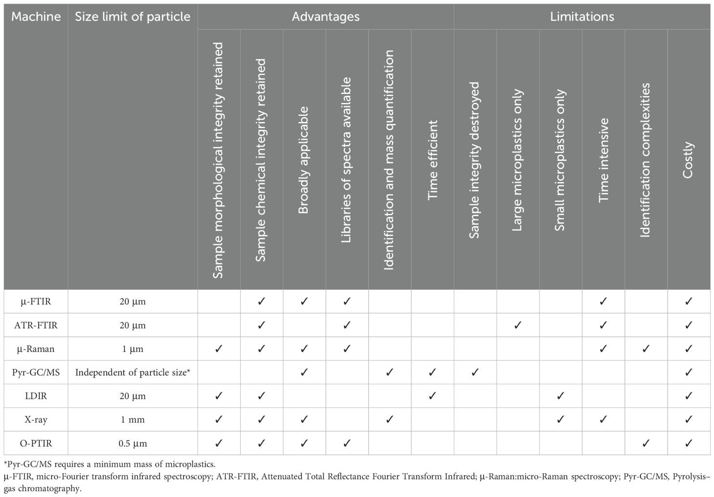 Table 5. Summary table of polymer identification instrumentation and their advantages, limitations, and minimum size that can be analysed.