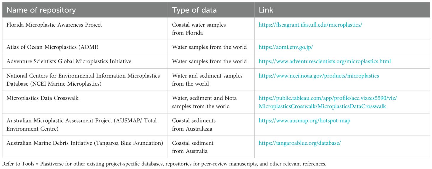 Table 7. Example databases established to collate and disseminate environmental information on the abundance and/or characteristics of microplastics. Repositories listed allow for the inclusion of microplastics data by researchers and other stakeholders for public access and use that is not platform-specific.