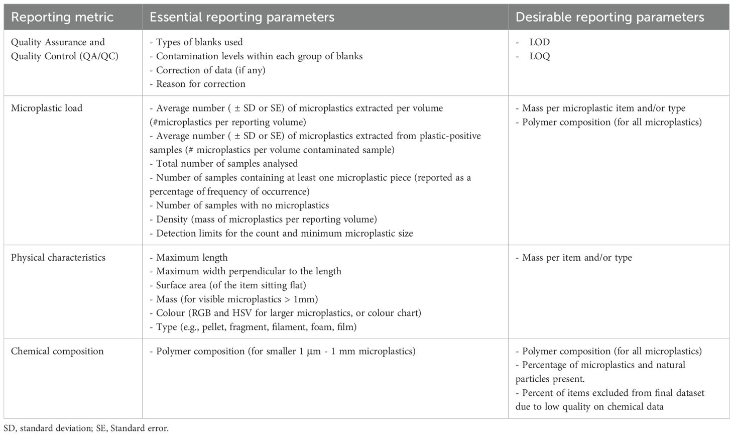 Table 8. Essential and desirable reporting parameters for microplastic load, physical characteristics and chemical composition.