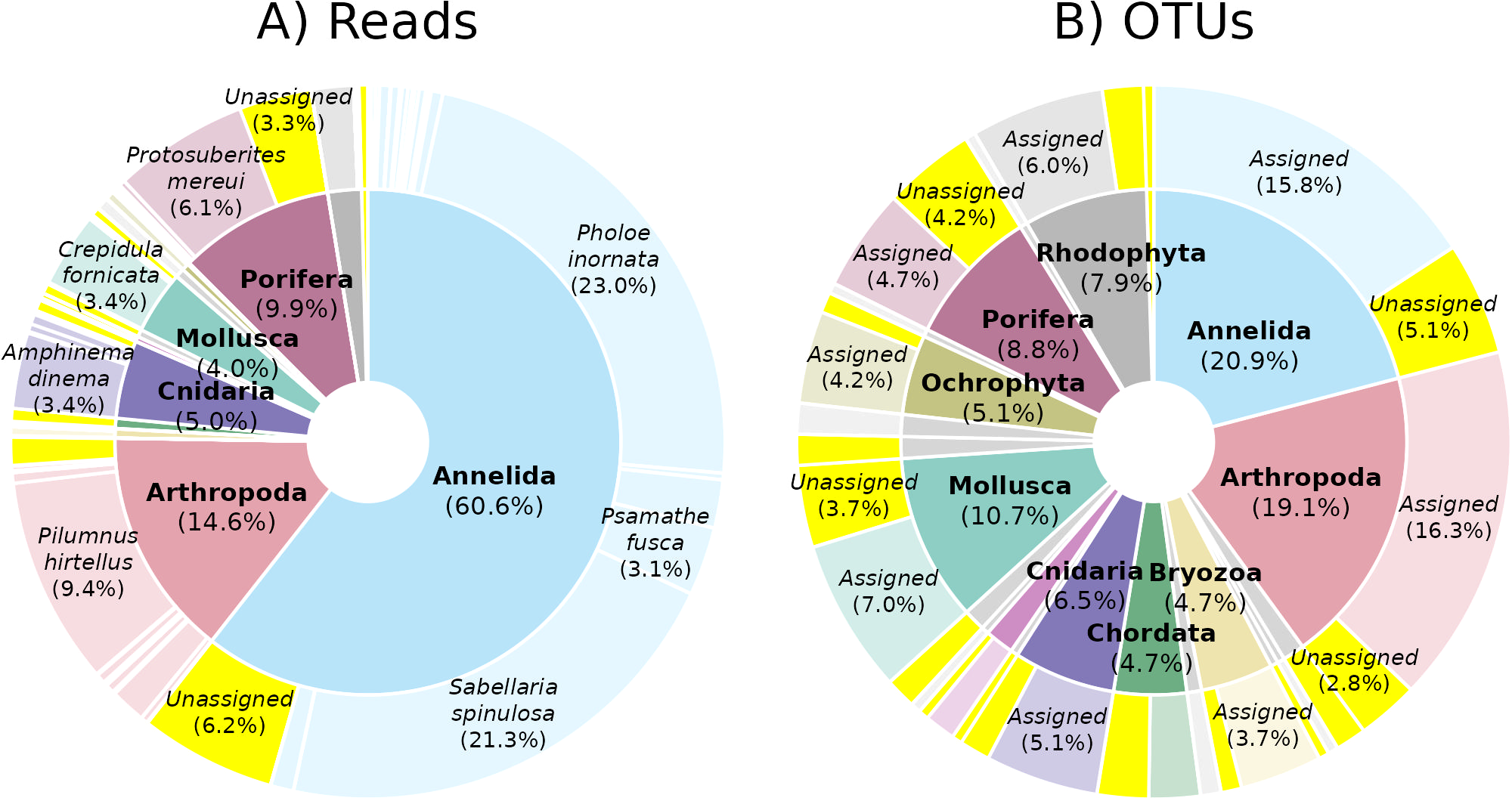 Metabarcoding read and OTU abundance across taxonomic groups. Summary of COI metabarcoding of bulk ARMS fractions by (A) multi-rarefied read count and (B) multiple-rarefied OTU count with phylum as the internal pie, species as the outer donut for plot (A), and whether or not an OTU was assigned a species as the outer donut for plot (B). Proportion of non-assigned reads and OTUs are highlighted in yellow. Only segments comprising >4% of phyla or >2.5% for species are labeled. See Supplementary Table 7 for precise figures for all phyla and species.
