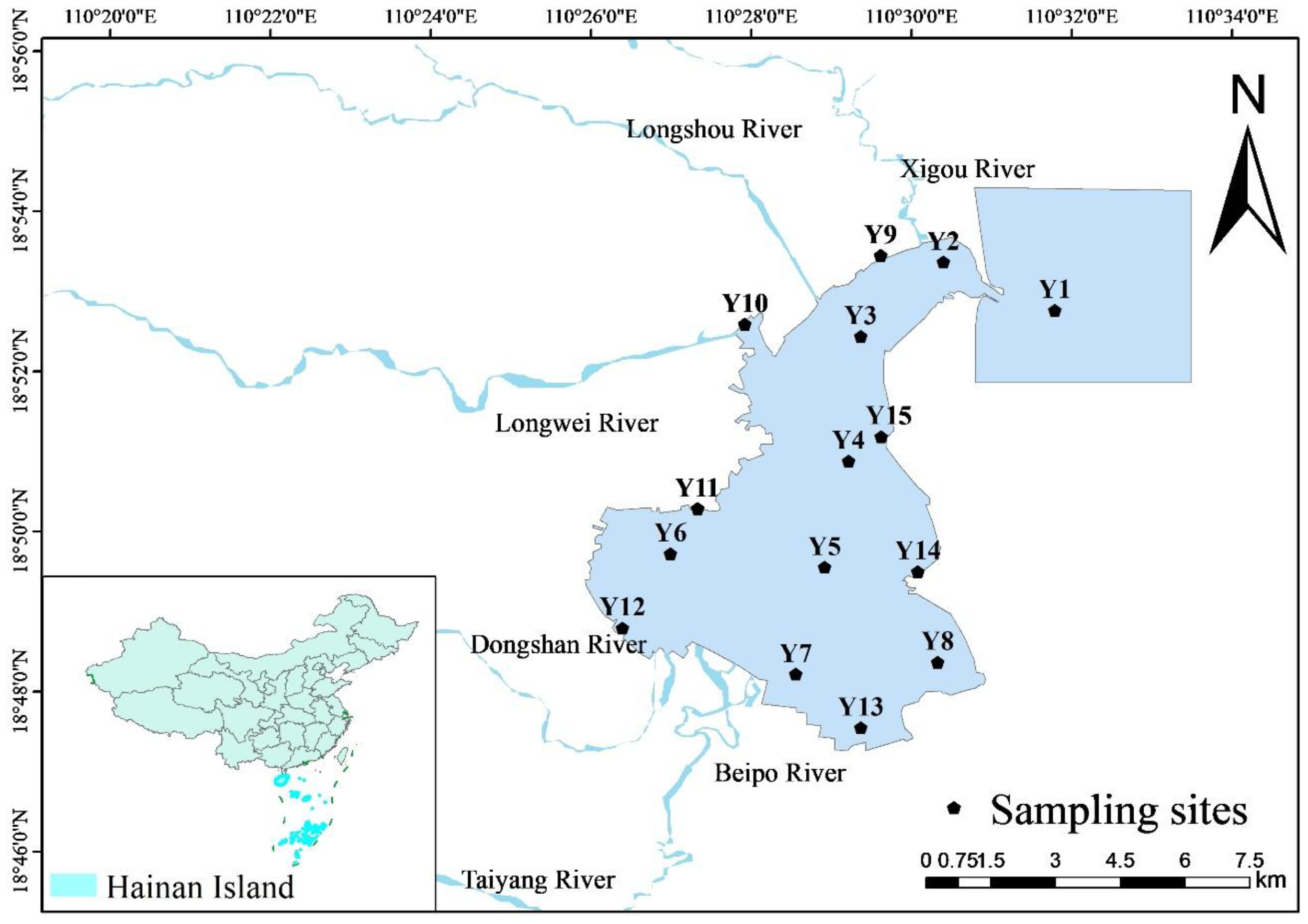 Xiaohai Lagoon (Figure 1), situated on the eastern coast of Hainan Island within Wanning City (18°30′–18°40′N ′ N, 110°10′–110°20′E ′ E), is the largest lagoon, spanning 43.78 km2 with an average depth of 1.5 m (max. 4 m). It connects to the South China Sea via a narrow tidal inlet (150 m long), facilitating brackish water exchange (Zhang et al., 2023). The lagoon’s elongated basin extends 10 km north to south and 7.5 km east to west, forming a shallow, semi-enclosed coastal ecosystem. The lagoon is also a confluence of rivers in the surrounding area, including the Taiyang, Longtou, Longwei, Dongshan, Longshou, Xigou, Beipo, and Baishi rivers (Compiling Committee of Records of China Bays, 1999). Notably, Taiyang is the longest river, approximately 78.7 km long, recording average annual runoff of 1.4×108m3 (Liu and Ge, 2012). The Taiyang River watershed spans 593 km² and primarily comprises agricultural areas. The Longtou River is about 33.2 kilometers long, and its watershed spans an area of 136 km². The Longwei and Dongshan rivers measure 38.2 km and 26.6 km in length, with their respective watersheds covering 158 km² and 97 km². Being in the tropical region, Xiaohai lagoon experiences an average yearly rainfall of 2,159 mm with distinct wet (May-October) and dry (November-April) seasons. The typical temperatures are approximately 28°C during the summer and 18°C in winter. The daily tide in the lagoon is irregular, up to 0.71 m at the entrance, reducing further inwards. The average salinity varies from 4 to 5 ppt within the lagoon, while it ranges from 8.1 to 31 ppt at the entrance (Liu and Ge, 2012). To capture spatial changes in heavy metal distribution and anthropogenic influences, 15 sampling sites were strategically distributed across Xiaohai Lagoon’s distinct hydrological zones (Figure 1). The sites were categorized into three zones: the lagoon inlet, inner lagoon, and intertidal areas to represent the heavy metal distribution effectively.