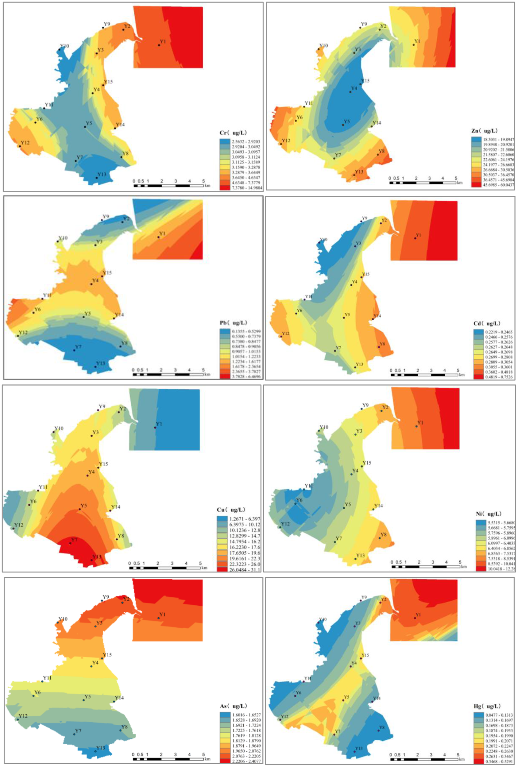 The spatial distribution of water heavy metal content in Xiaohai lagoon.