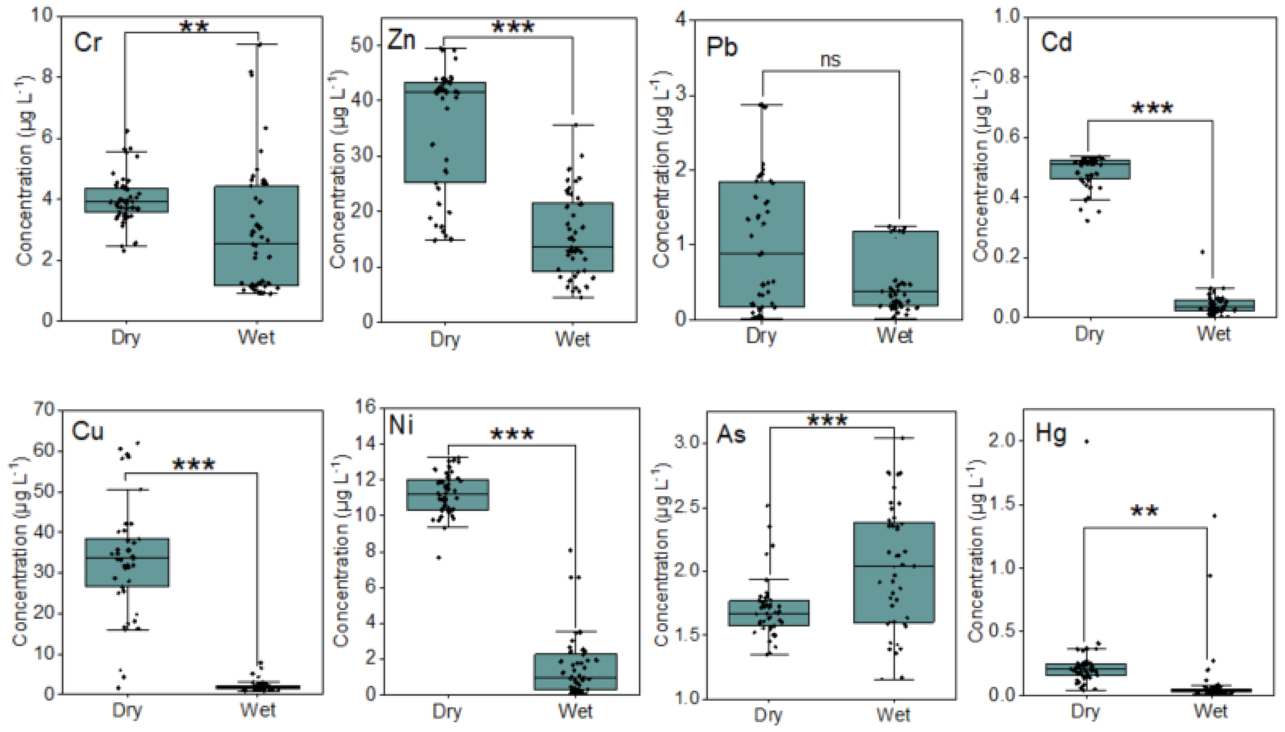 Seasonal variation of water heavy metal content. Significance level * (p < 0.05), ** (p < 0.01), and *** (p < 0.001) t-test.