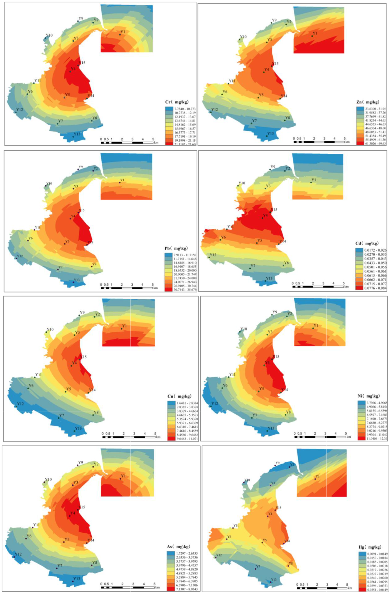 The spatial distribution of sediment heavy metal content in Xiaohai lagoon.
