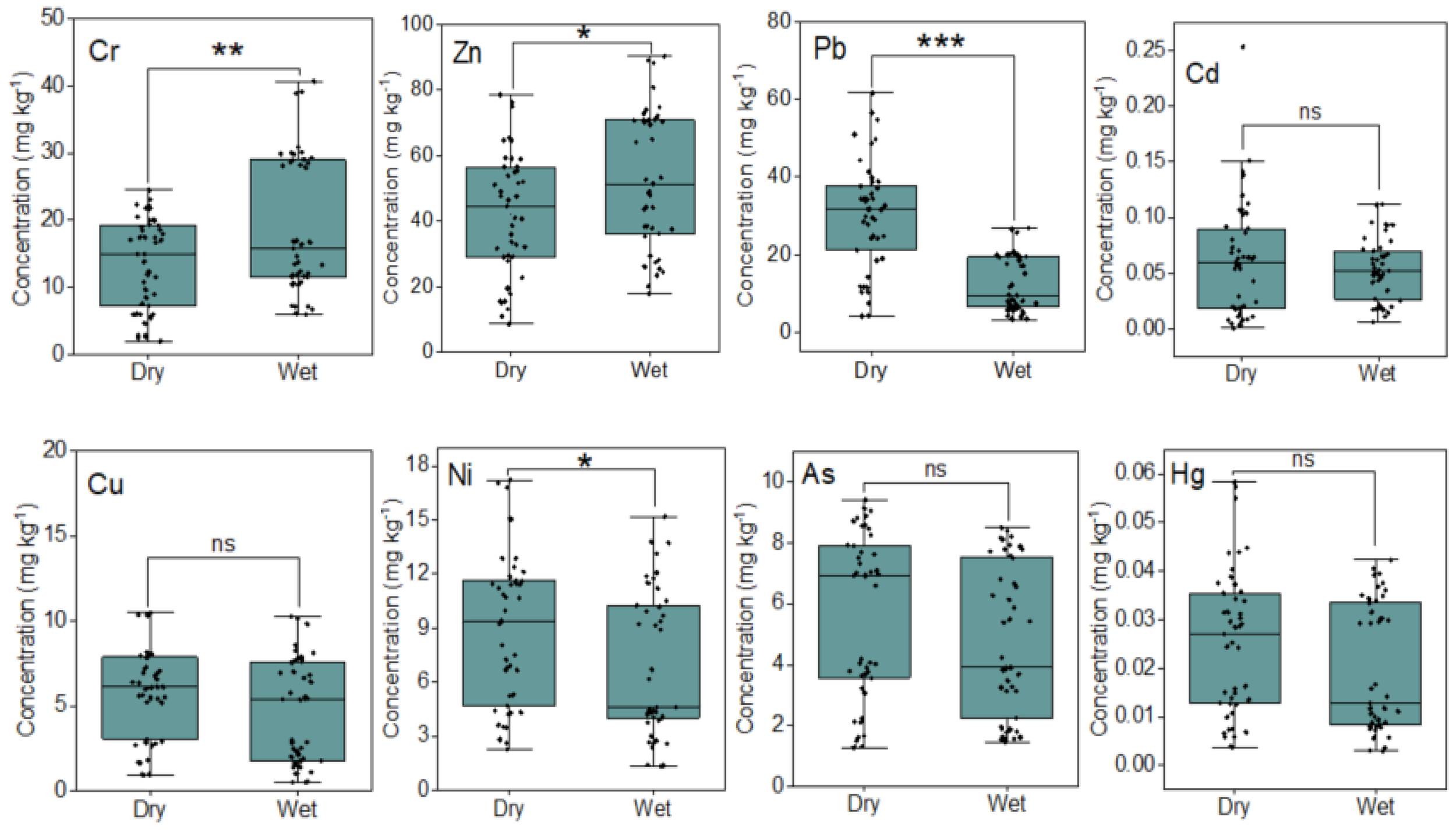 Seasonal variation of sediment heavy metal content in Xiaohai lagoon. Significance level * (p < 0.05), ** (p < 0.01), and *** (p < 0.001) t-test.