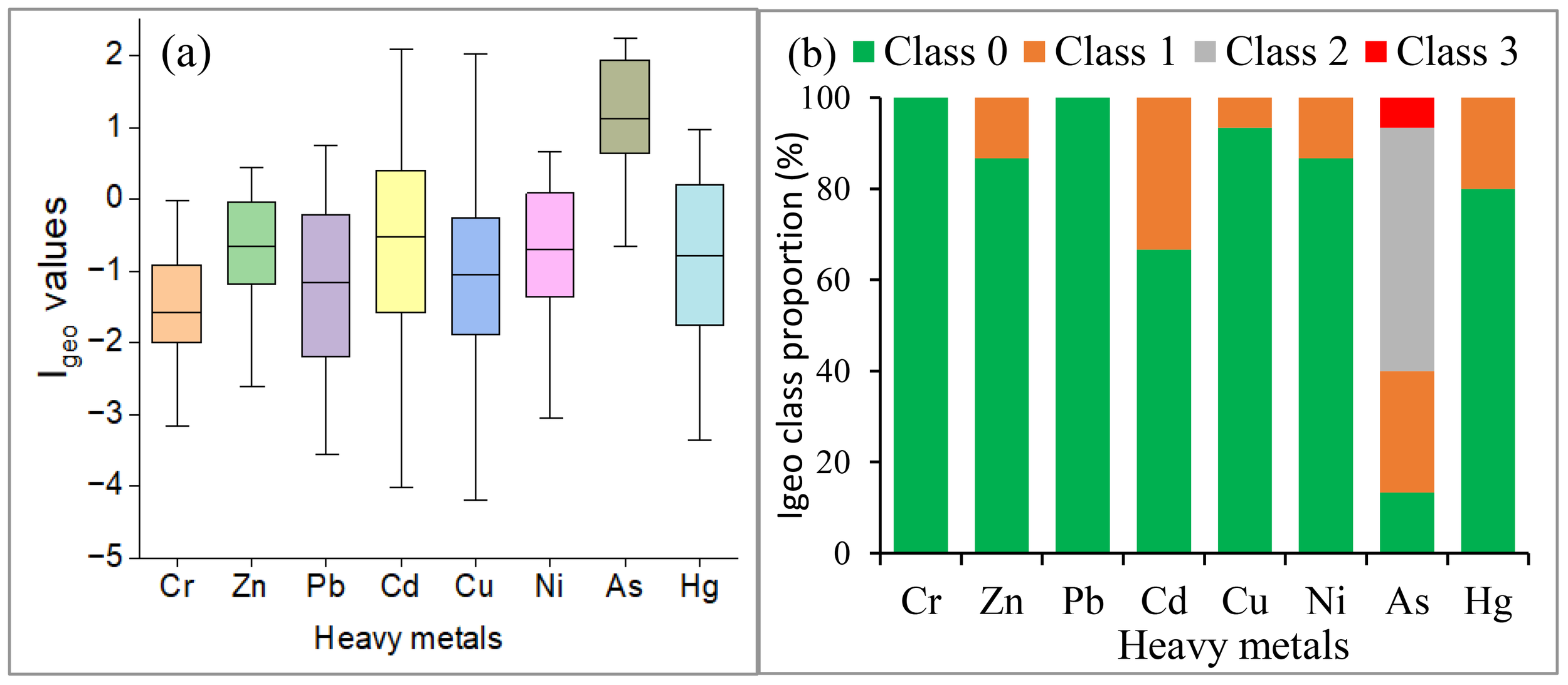 Box plots of (a)Igeo values and (b) proportions of Igeo classifications of the metals.